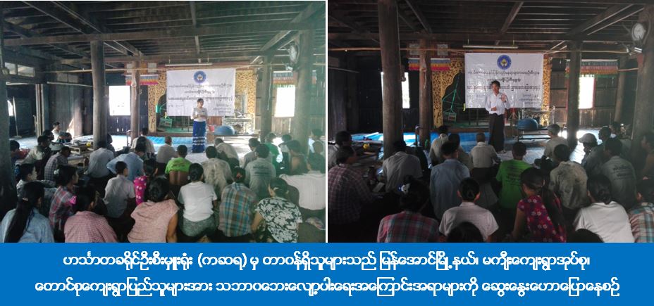 (၂၇-၁၂-၂၀၁၆) ရက်နေ့တွင် ဧရာဝတီတိုင်းဒေသကြီး၊ ဟင်္သာတခရိုင်၊ မြန်အောင်မြို့နယ်၊ မကျီးကျေးရွာအုပ်စု၊ တောင်စုကျေးရွာ၌ သဘာဝဘေးလျော့ပါးရေး အသိပညာပေးဟောပြောဆွေးနွေးပွဲ ကျင်းပပြုလုပ်ရာ ဟင်္သာတခရိုင်ဦးစီးမှူးရုံး (ကဆရ) မှ တာဝန်ရှိသူများက သွားရောက်ဆွေးနွေးဟောပြောခဲ့ပြီး ကျေးရွာနေပြည်သူ (၅၀) ဦးခန့်တက်ရောက်ခဲ့ကြောင်း သိရှိရပါသည်။
