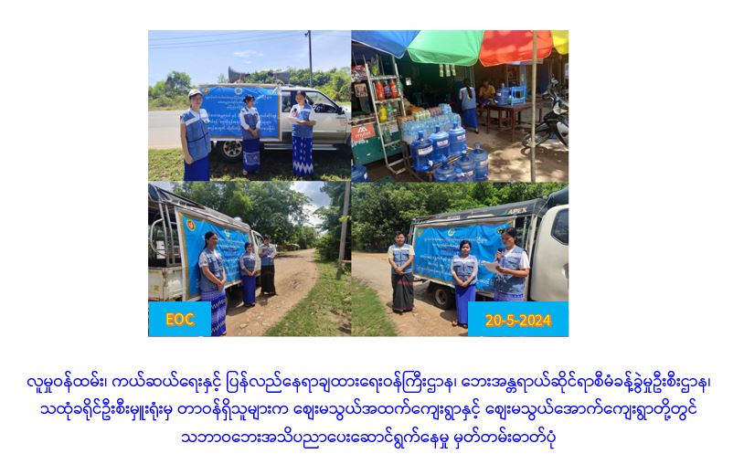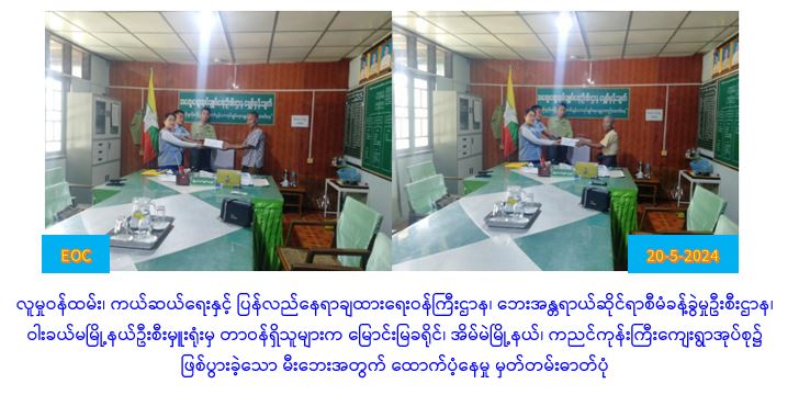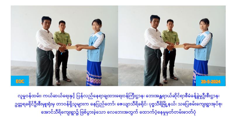 လူမှုဝန်ထမ်း၊ ကယ်ဆယ်ရေးနှင့် ပြန်လည်နေရာချထားရေးဝန်ကြီးဌာန၊ ဘေးအန္တရာယ်ဆိုင်ရာစီမံခန့်ခွဲမှုဦးစီးဌာန၊ ဥတ္တရခရိုင်ဦးစီးမှူးရုံးမှ တာဝန်ရှိသူများသည် ပြည်ထောင်စုနယ်မြေ၊ နေပြည်တော်၊ ဇေယျာသီရိခရိုင်၊ ပုဗ္ဗသီရိမြို့နယ်၊ သပြေစမ်းကျေးရွာအုပ်စု၊ အောင်သီရိကျေးရွာ၌ (၂၀.၅.၂၀၂၄)ရက်နေ့၊ (၀၆:၀၀)နာရီအချိန်တွင် ဖြစ်ပွားခဲ့သောလေဘေးကြောင့် တစ်စိတ်တစ်ပိုင်းပျက်စီးနေအိမ်(၂)လုံးအတွက် အိမ်ဆောက်ပစ္စည်းဖိုးထောက်ပံ့ငွေ (၁၀၀,၀၀၀ိ/-)၊ ဘေးသင့်လူဦးရေ (၉) ဦးအတွက် ဆန်ရိက္ခာဖိုးထောက်ပံ့ငွေ (၁၈,၉၀၀ိ/-)၊ စုစုပေါင်းထောက်ပံ့ငွေ (၁၁၈,၉၀၀ိ/-) တို့အား သပြေစမ်းကျေးရွာအုပ်စုအုပ်ချုပ်ရေးမှူးနှင့် ပုဗ္ဗသီရိမြို့နယ်၊ အထွေထွေအုပ်ချုပ်ရေးဦးစီးဌာနမှ တာဝန်ရှိသူများနှင့်အတူ ဘေးသင့်ပြည်သူများထံသို့ လက်ဝယ်အရောက် သွားရောက်ထောက်ပံ့ခဲ့ကြောင်း သတင်းရရှိပါသည်။ #ha_sgw #npw_may_2024 Source: ဥတ္တရခရိုင်ဦးစီးမှူးရုံး(ဘစမ)