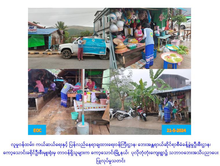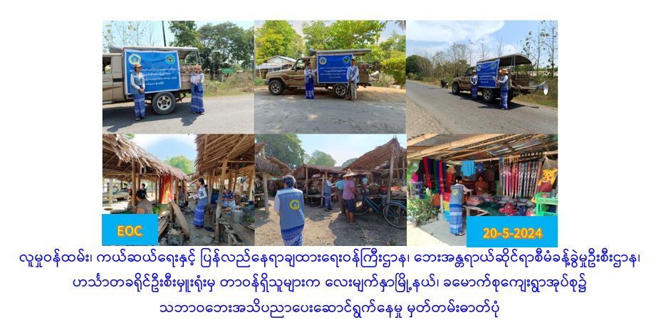 လူမှုဝန်ထမ်း၊ ကယ်ဆယ်ရေးနှင့်ပြန်လည်နေရာချထားရေးဝန်ကြီးဌာန၊ ဘေးအန္တရာယ်ဆိုင်ရာစီမံခန့်ခွဲမှု ဦးစီးဌာန၊ ဟင်္သာတခရိုင်ဦးစီးမှုးရုံးမှ တာဝန်ရှိသူများသည် (၂၀-၅-၂၀၂၄) ရက်နေ့တွင် လေးမျက်နှာ မြို့နယ်၊ ခမောက်စုကျေးရွာအုပ်စုအတွင်း လေပြင်းဘေးနှင့် မိုးကြိုးဘေးအန္တရာယ် ကြိုတင်ကာကွယ်ရေးအတွက် ဆောင်ရန်/ ရှောင်ရန်အချက်များအား ရပ်ကွက်နေပြည်သူများ သိရှိနိုင်စေရန် လိုက်လံနှိုးဆော်အသိပညာပေးခြင်းနှင့် လက်ကမ်းစာစောင်များ ဖြန့်ဝေခြင်းတို့ကို ဆောင်ရွက်ခဲ့ကြောင်း သတင်းရရှိပါသည်။ #ar #ayy_may_2024 Source: ဟင်္သာတခရိုင်ဦးစီးမှူးရုံး(ဘစမ)