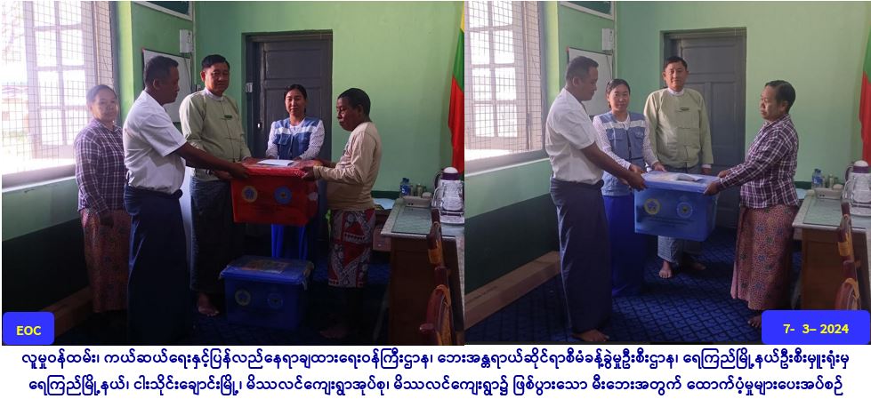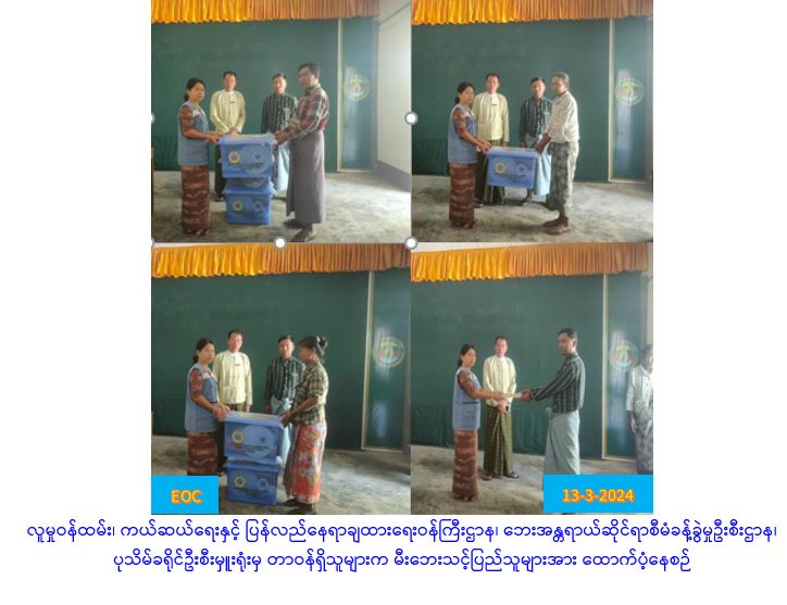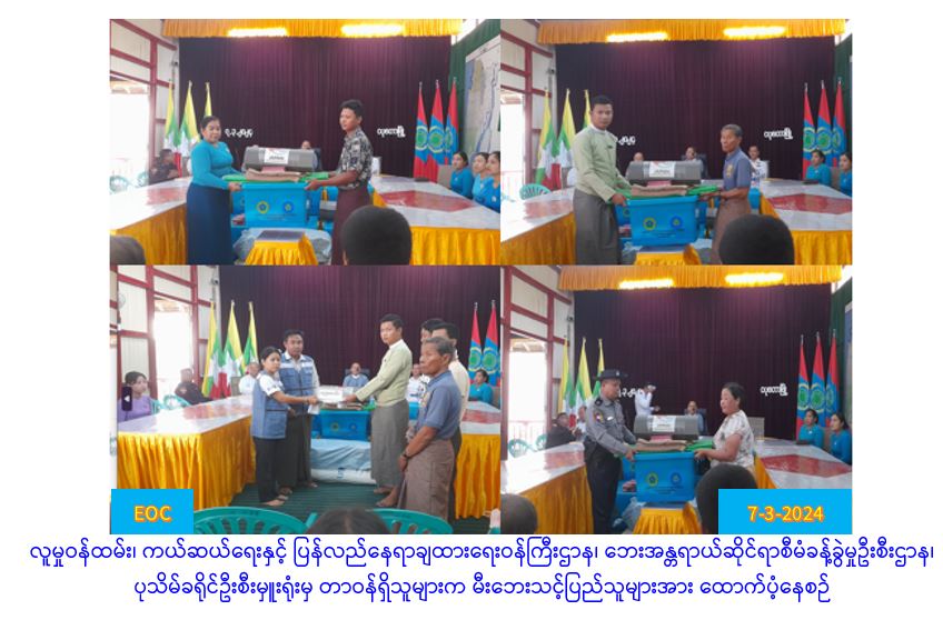 လူမှု၀န်ထမ်း၊ ကယ်ဆယ်ရေးနှင့်ပြန်လည်နေရာချထားရေး၀န်ကြီးဌာန၊ ဘေးအန္တရာယ်ဆိုင်ရာစီမံခန့်ခွဲမှုဦးစီးဌာန၊ ဧရာ၀တီတိုင်းဒေသကြီးဦးစီးမှူးရုံးနှင့် ပုသိမ်ခရိုင်ဦးစီးမှူးရုံးမှ တာ၀န်ရှိသူများသည် ပုသိမ်ခရိုင်၊ ငပုတောမြို့၊ တောင်ပိုင်းရပ်ကွက်၊ မဥ္ဇူလမ်းတွင် (၆.၃.၂၀၂၄)ရက်နေ့၊ (၁၇း၃၅)နာရီအချိန်၌ ဖြစ်ပွားခဲ့သော မီးဘေးကြောင့် မီးလောင်ပျက်စီးခဲ့သောနေအိမ်(၁၀)လုံးအတွက် အိမ်ဆောက်ပစ္စည်းဖိုးထောက်ပံ့ငွေ (၁,၄၀၀,၀၀ဝိ/-)၊ ဘေးသင့်လူဦးရေ(၂၈)ဦးအတွက် (၇)ရက်စာ ဆန်ရိက္ခာဖိုးထောက်ပံ့ငွေ(၅၈,၈၀ဝိ/-)၊ စုစုပေါင်းထောက်ပံ့ငွေ(၁,၄၅၈,၈၀ဝိ/-)နှင့် ထောက်ပံ့ငွေ (၅၅၃,၂၁၆/-) တန်ဖိုးရှိ ကယ်ဆယ်ရေးပစ္စည်း (၁၇) မျိုးပါ (၁၀)အိမ်ထောင်စာ ၊ အလှူပစ္စည်း JICA စောင်(၁၀)ထည်နှင့် အိပ်ယာခင်း(၁၀)ခု၊ UNICEF တာပေါ်လင် (၁၀)လိပ်နှင့် ကာဘော်လိပ်ဆပ်ပြာ(၂၀)တောင့်တို့အား (၇.၃.၂၀၂၄)ရက်နေ့၊ (၁၂း၁၀)နာရီအချိန်တွင် သက်ဆိုင်ရာ … Read more