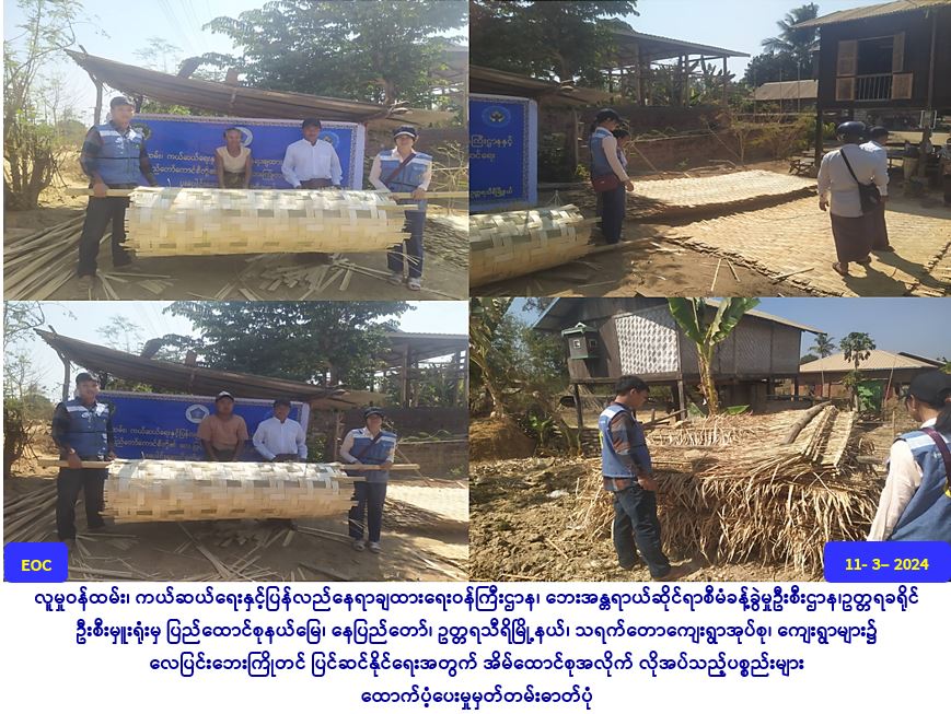 လူမှုဝန်ထမ်း၊ ကယ်ဆယ်ရေးနှင့်ပြန်လည်နေရာချထားရေးဝန်ကြီးဌာန၊ ဘေးအန္တရာယ်ဆိုင်ရာစီမံခန့်ခွဲမှုဦးစီးဌာန၊ ဥတ္တရခရိုင်ဦးစီးမှူးရုံးမှ တာဝန်ရှိသူများသည် ပြည်ထောင်စုနယ်မြေ၊ နေပြည်တော်၊ ဥတ္တရသီရိမြို့နယ်၊ မင်းကုန်းကျေးရွာအုပ်စု၊ အောင်သပြေကျေးရွာနှင့် မှုံနှစ်ကျေးရွာအတွင်း လေပြင်းဘေးဒဏ်ခံနိုင်ရေးအတွက် အားဖြည့်မွမ်းမံပြင်ဆင်နိုင်ရန် အိမ်ထောင်စု(၃၆)လုံးအား အိမ်ထောင်စုအလိုက် လိုအပ်သည့်ထောက်ပံ့ပစ္စည်းများအား (၄.၃.၂၀၂၄)ရက်နေ့၊ (၁၁း၀၀)နာရီအချိန်တွင် ကျေးရွာအုပ်ချုပ်ရေးမှူးနှင့် တာဝန်ရှိသူများရှေ့မှောက်၌ ပြည်သူများထံသို့ လက်ဝယ်အရောက် သွားရောက်ထောက်ပံ့ခဲ့ကြောင်း သတင်းရရှိပါသည်။ #prep_sgw #npt_mar_2024 Source: ဥတ္တရခရိုင်ဦးစီးမှူးရုံး(ဘစမ)