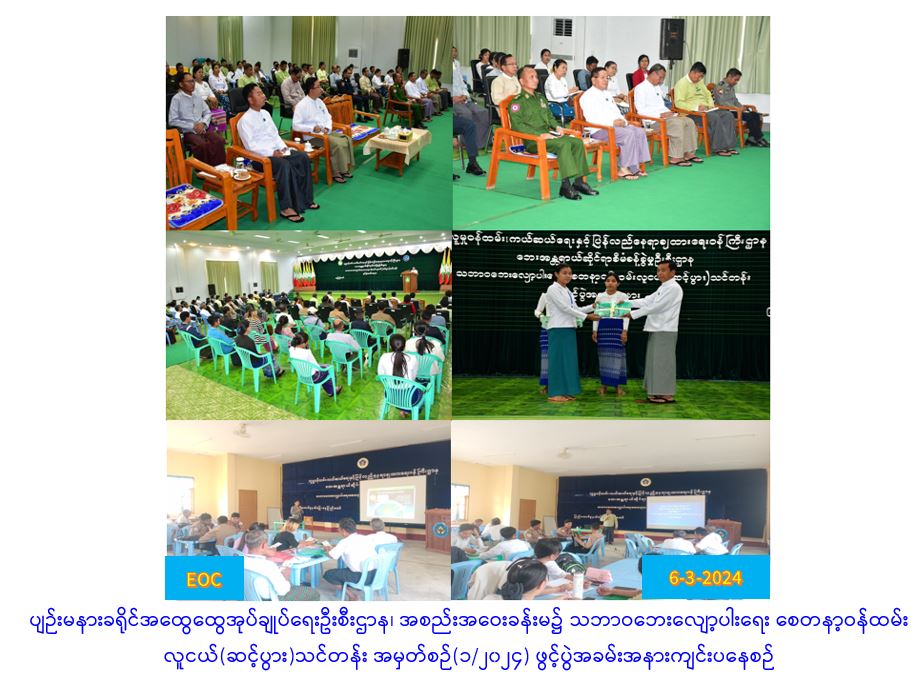 ပျဉ်းမနားခရိုင်အထွေထွေအုပ်ချုပ်ရေးဦးစီးဌာန၊ အစည်းအဝေးခန်းမ၌ “သဘာဝဘေးလျော့ပါးရေး စေတနာ့ဝန်ထမ်း လူငယ်(ဆင့်ပွား)သင်တန်း အမှတ်စဉ်(၁/၂၀၂၄) ဖွင့်ပွဲအခမ်းအနား”ကျင်းပမှုသတင်း