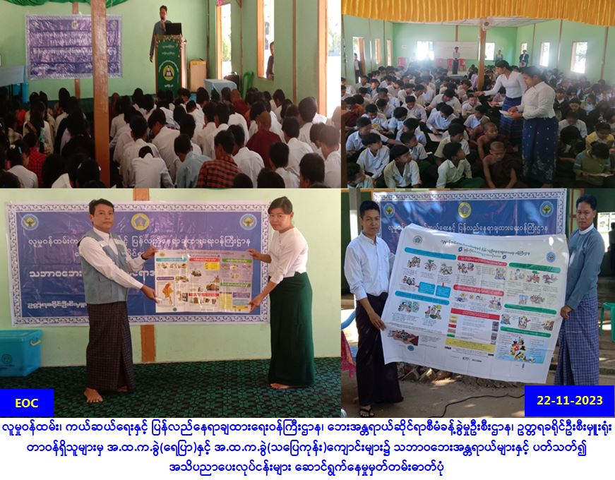 လူမှုဝန်ထမ်း၊ ကယ်ဆယ်ရေးနှင့် ပြန်လည်နေရာချထားရေးဝန်ကြီးဌာန၊ ဘေးအန္တရာယ်ဆိုင်ရာစီမံခန့်ခွဲမှု ဦးစီးဌာန၊ မြောင်းမြခရိုင်ဦးစီးမှူးရုံးမှ တာဝန်ရှိသူများသည် (၂၃-၁၁-၂၀၂၃)ရက်နေ့၊ (၀၉:၃၀)အချိန်မှ (၁၂:၀၀)နာရီအချိန်အထိ မြောင်းမြခရိုင်၊ မြောင်းမြမြို့နယ်၊ အ.ထ.က (၄) ကျောင်းတွင် ကျောင်းအုပ်ကြီး နှင့်တကွ ဆရာ/ဆရာမများ၊ ကျောင်းသား/သူများ စုစုပေါင်း (၁၅၀)ဦးတို့အား ဦးစီး ဌာနမှ လုပ်ငန်းဆောင်ရွက်နေမှုများ၊ ထောက်ပံ့ပေးမှုများ၊ သဘာဝဘေးနှင့်ပတ်သတ်သော ဆောင်ရန်/ ရှောင်ရန်များ၊ မီးခိုးညစ်ညမ်းမှုအကြောင်း၊ တောမီးအန္တရာယ်အကြောင်းနှင့် ပလပ်စတစ် ညစ်ညမ်းမှု အကြောင်း ဆောင်ရန်/ ရှောင်ရန်အချက်များအား ဆွေးနွေးဟောပြောခဲ့ပြီး ဗီနိုင်းပိုစတာနှင့် လက်ကမ်း စာစောင်ဖြန့်ဝေပေးခြင်းများ ဆောင်ရွက်ခဲ့ပါကြောင်း သတင်းရရှိပါသည်။ … Read more