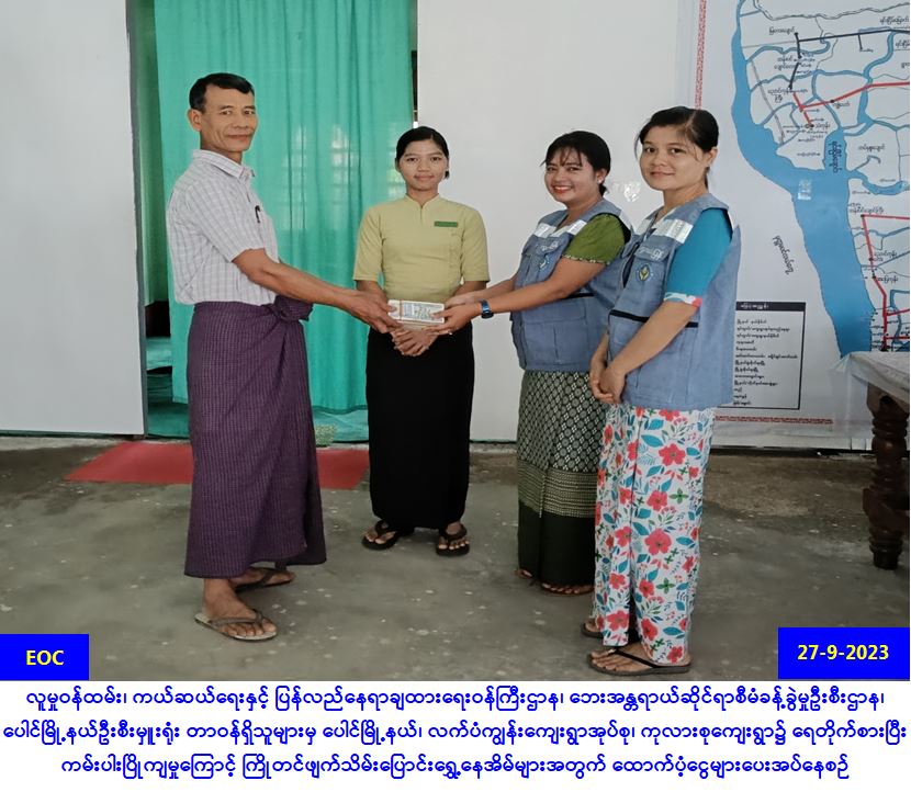 လူမှုဝန်ထမ်း၊ ကယ်ဆယ်ရေးနှင့် ပြန်လည်နေရာချထားရေးဝန်ကြီးဌာန၊ ဘေးအန္တရာယ်ဆိုင်ရာစီမံခန့်ခွဲမှုဦးစီးဌာန၊ ရန်ကုန်တိုင်းဒေသကြီးဦးစီးမှူးရုံးမှ တာဝန်ရှိသူများသည် ရန်ကုန်တိုင်းဒေသကြီး၊ တိုက်ကြီးခရိုင်၊ တိုက်ကြီးမြို့နယ်၊ အဖျောက်မြို့၊ ရေပေါ်သောင်ကျေးရွာ၌ (၁၁-၉-၂၀၂၃)ရက်နေ့၊ (၁၃:၀၀) နာရီအချိန်ခန့်တွင် မြစ်ကမ်းပါးပြိုကျမှုကြောင့် ကြိုတင်ပြောင်းရွှေ့ခဲ့သည့် နေအိမ်(၆)လုံး၊ အိမ်ထောင်စု(၆)စု၊ လူဦးရေ(၂၄)ဦးတို့အတွက် ဆန်ရိက္ခာဖိုးထောက်ပံ့ငွေ(၅၀,၄၀ဝိ/-)၊ အိမ်ဆောက်ပစ္စည်းဖိုးထောက်ပံ့ငွေ(၆၀၀,၀၀ဝိ/-)၊ စုစုပေါင်းထောက်ပံ့ငွေ (၆၅၀,၄၀ဝိ/-)တိတိတို့အား (၂၁-၉-၂၀၂၃)ရက်နေ့၊ (၁၁:၃၀)အချိန်နာရီတွင် တိုက်ကြီးမြို့နယ်အထွေထွေအုပ်ချုပ်ရေးဦးစီးဌာနမှ တာဝန်ရှိသူများနှင့်အတူ ဘေးသင့်ပြည်သူများ၏ လက်ဝယ်အရောက်ထောက်ပံ့ပေးအပ်ခဲ့ကြောင်း သတင်းရရှိပါသည်။ #ha_rbe #ygn_sep2023 Source: ရန်ကုန်တိုင်းဒေသကြီးဦးစီးမှူးရုံး (ဘစမ)
