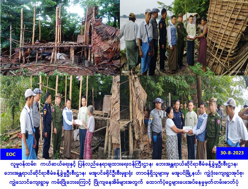 လူမှုဝန်ထမ်း၊ ကယ်ဆယ်ရေးနှင့် ပြန်လည်နေရာချထားရေးဝန်ကြီးဌာန၊ ဘေးအန္တရာယ်ဆိုင်ရာစီမံခန့်ခွဲမှုဦးစီးဌာန၊ ရန်ကုန်တောင်ပိုင်းခရိုင်ဦးစီးမှူးရုံးမှ တာဝန်ရှိသူများသည် သန်လျင်ခရိုင်၊ သုံးခွမြို့နယ်၊ အဇတ်ဝကျေးရွာအုပ်စု၊ အဇတ်ဝကျေးရွာတွင် ၂၆-၈-၂၀၂၃ ရက်နေ့၊ (၁၇:၀၀) နာရီအချိန်ခန့်၌ မိုးသည်းထန်စွာရွာသွန်းပြီး လေပြင်းတိုက်ခတ်မှုကြောင့် သာသနိကအဆောက်အဦ (၁) လုံး၊ (သွပ်မိုး/ ပျဉ်ထောင်) လူနေအိမ် (၂) လုံး၊ (သွပ်မိုး/ ပျဉ်ထောင်/ အုတ်ညှပ်) လူနေအိမ် (၁) လုံး၊ အုတ်ညှပ် (၁) ထပ် လူနေအိမ် (၁) လုံး၊ (ထရံကာ/ ဓနိမိုး) လူနေအိမ် (၁) … Read more