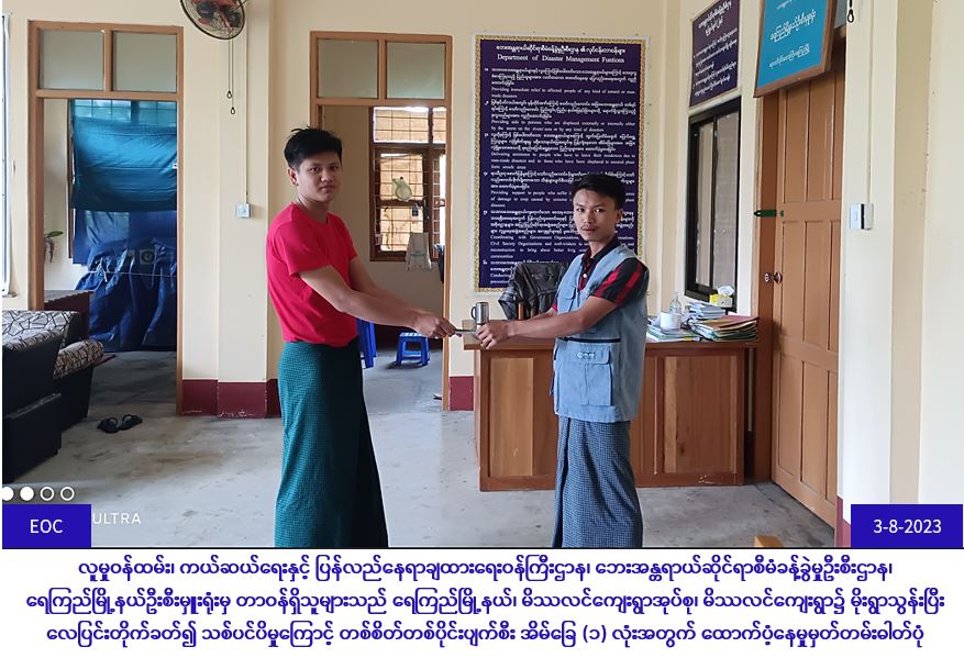 လူမှုဝန်ထမ်း၊ ကယ်ဆယ်ရေးနှင့် ပြန်လည်နေရာချထားရေးဝန်ကြီးဌာန၊ ဘေးအန္တရာယ်ဆိုင်ရာစီမံခန့်ခွဲမှုဦးစီး ဌာန၊ မြိတ်ခရိုင်ဦးစီးမှူးရုံးမှ တာဝန်ရှိသူများသည် (၁၈-၇-၂၀၂၃)ရက်နေ့ ကျွန်းစုမြို့နယ်၊ ကံမော်ကျေးရွာအုပ်စု၊ ကော်မယ်ကျေးရွာတွင် လေပြင်းတိုက်ခတ်မှုကြောင့် လုံးဝပျက်စီးနေအိမ်(၁)လုံးအတွက် အိမ်ဆောက် ပစ္စည်းဖိုး(၁၀၀,၀၀ဝ/-)ကျပ်၊ ဘေးသင့်အိမ်ထောင်စု(၁)စုမှ လူဦးရေ(၃)ဦးအတွက် ဆန်ရိက္ခာဖိုး(၆,၃၀ဝ/-)ကျပ်၊ စုစုပေါင်းကယ်ဆယ်ရေးရန်ပုံငွေကျပ် (၁၀၆,၃၀၀/)နှင့် (၆၁,၇၆၀)ကျပ်တန်ဖိုးရှိ ကယ်ဆယ်ရေးပစ္စည်း(၁၈)မျိုးပါ (၁)ပုံးတို့အား (၃၁-၇-၂၀၂၃)ရက်နေ့ (၁၁း၃၀)အချိန်တွင် တာဝန်ရှိသူများရှေ့မှောက်၌ ဘေးသင့်ပြည်သူများ လက်ဝယ်အရောက် ထောက်ပံ့ပေးအပ်ခဲ့ပါကြောင်း သတင်းရရှိပါသည်။ #ha_sgw #tny_aug2023 Source: မြိတ်ခရိုင်ဦးစီးမှူးရုံး (ဘစမ)