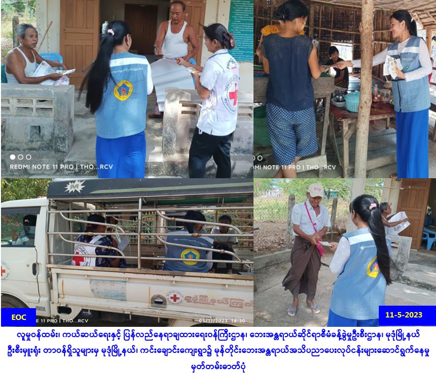 လူမှုဝန်ထမ်း၊ ကယ်ဆယ်ရေးနှင့် ပြန်လည်နေရာချထားရေးဝန်ကြီးဌာန၊ ဘေးအန္တရာယ်ဆိုင်ရာစီမံခန့်ခွဲမှုဦးစီးဌာန၊ ကသာခရိုင်ဦးစီးရုံးမှ တာဝန်ရှိသူများသည် (၁၀-၅-၂၀၂၃) ရက်နေ့နှင့် (၁၁-၅-၂၀၂၃) ရက်နေ့၊(၁၆:၃၀) အချိန်မှ (၁၈:၀၀) နာရီအချိန်ထိ ကသာမြို့နယ်အတွင်းရှိ မြို့ပေါ်ရပ်ကွက်နှင့် စျေးများတွင် လေဖိအားနည်းရပ်ဝန်းမှ အားကောင်းသော ဆိုင်ကလုန်းမုန်တိုင်းအဖြစ်သို့ ပြောင်းလဲလာသည့်အတွက် ပြည်သူများ ကြိုတင်သတိပြုနိုင်ရန် ဆောင်ရန်/ရှောင်ရန်အချက်များနှင့် မိုးလေဝသနှင့်ဇလဗေဒညွှန်ကြားမှုဦးစီးဌာန၏ အချိန်နှင့် တပြေးညီထုတ်ပြန် ချက်များကို စောင့်ကြည့်၍ လိုအပ်သည့်ကြိုတင်ပြင်ဆင်မှုများ ဆောင်ရွက်သွားနိုင်ရန် မြို့နယ်အထွေထွေ အုပ်ချုပ်ရေးဦးစီးဌာန၊ မီးသတ်ဦးစီးဌာနနှင့် ပြန်/ဆက်ဦးစီးဌာနတို့မှ တာဝန်ရှိသူများနှင့်ပူးပါင်း၍ အသိပေးတိုက် တွန်းနှိုးဆော်ခြင်းများ ဆောင်ရွက်ခဲ့ပါကြောင်း သတင်းရရှိပါသည်။ Source: … Read more