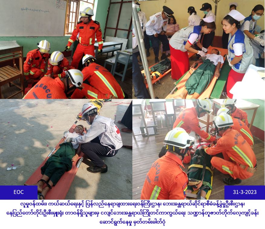 လူမှုဝန်ထမ်း၊ ကယ်ဆယ်ရေးနှင့် ပြန်လည်နေရာချထားရေးဝန်ကြီးဌာန၊ ဘေးအန္တရာယ်ဆိုင်ရာစီမံ ခန့်ခွဲမှုဦးစီးဌာန၊ နေပြည်တော်တိုင်းဦးစီးမှူးရုံးမှ တာဝန်ရှိသူများသည် (၃၁-၃-၂၀၂၃)ရက်နေ့၊ (၀၈:၀၀) အချိန်မှ (၁၀:၃၀)အချိန်အထိ စမတောင်ပရဟိတကျောင်းတွင် ငလျင်ဘေးအန္တရာယ်ကြိုတင်ကာကွယ်ရေး သဏ္ဍာန်တူဇာတ်တိုက်လေ့ကျင့်ခန်းကို ဌာနဆိုင်ရာ အဖွဲ့အစည်း အသီးသီးမှ တာဝန်ရှိသူများ၊ မီးသတ် ဦးစီးဌာန၊ ကျန်းမာရေးဦးစီးဌာန၊ ကြက်ခြေနီကြီးကြပ်မှုကော်မတီ၊ ပရဟိတအဖွဲ့များ၊ စမတောင် ပရဟိတကျောင်းမှ တာဝန်ရှိသူများ၊ ဆရာ/ဆရာမများနှင့် ကျောင်းသား၊ ကျောင်းသူများ စုစုပေါင်း (၂၀၀) ဦးတို့ဖြင့် ပူးပေါင်း၍ ဆောင်ရွက်ခဲ့ပါကြောင်း သတင်းရရှိပါသည်။ #simex_eqk #npw_mar2023 Source: နေပြည်တော်တိုင်းဦးစီးမှူးရုံး (ဘစမ)