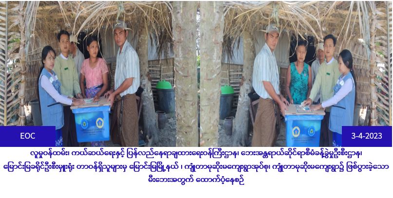 လူမှုဝန်ထမ်း၊ ကယ်ဆယ်ရေးနှင့် ပြန်လည်နေရာချထားရေးဝန်ကြီးဌာန၊ ဘေးအန္တရာယ်ဆိုင်ရာစီမံခန့်ခွဲမှု ဦးစီးဌာန၊ ပြည်ထောင်စုနယ်မြေ၊ နေပြည်တော်တိုင်းဦးစီးမှူးရုံးမှ တာဝန်ရှိသူများသည် လယ်ဝေးခရိုင်၊ လယ်ဝေးမြို့နယ်၊ သော်မှော်ကုန်းကျေးရွာအုပ်စု၊ သော်မှော်ကုန်းကျေးရွာ၌ (၃၁-၃-၂၀၂၃)ရက်နေ့၊ (၁၀:၁၅) အချိန်တွင် ဖြစ်ပွားခဲ့သောမီးဘေးကြောင့် လုံးဝပျက်စီးဆုံးရှုံးခဲ့သော နေအိမ်(၁)လုံးအတွက် အိမ်ဆောက် ပစ္စည်းဖိုးထောက်ပံ့ငွေ(၁၀၀,၀၀ဝိ/-)၊ တစ်စိတ်တစ်ပိုင်း လောင်ကျွမ်းခဲ့သော နေအိမ်(၁)လုံးအတွက် အိမ်ဆောက် ပစ္စည်းဖိုးထောက်ပံ့ငွေ (၅၀၀,၀၀ိ/-) ဘေးသင့်လူဦးရေ(၇)ဦးအတွက် ဆန်ရိက္ခာဖိုး ထောက်ပံ့ငွေ(၁၄,၇၀ဝိ/-)၊ စုစုပေါင်းထောက်ပံ့ငွေ(၁၆၄,၇၀ဝိ/-)နှင့် (၄၈,၅၁၁/-)တန်ဖိုးရှိ ကယ်ဆယ်ရေးပစ္စည်း (၁၈)မျိုးပါ ထောက်ပံ့ ပစ္စည်းပုံး(၁)ပုံးတို့အား (၃-၄-၂၀၂၃)ရက်နေ့၊ (၁၁:၂၆)နာရီအချိန်တွင် ဘေးသင့်ပြည့်သူများလက်ဝယ်အရောက် ထောက်ပံ့ပေးအပ်ခဲ့ပါကြောင်း သတင်းရရှိပါသည်။ … Read more