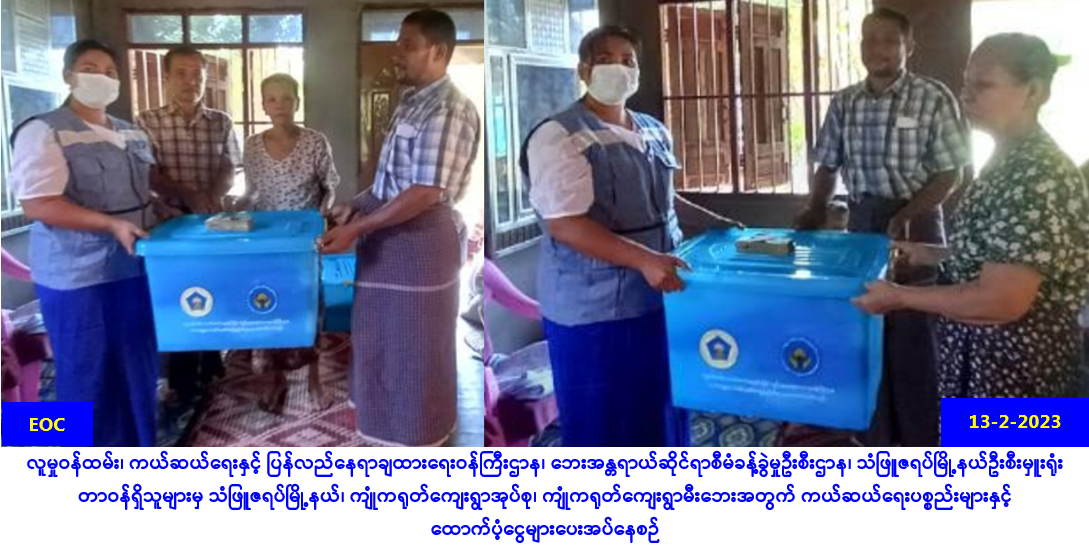 လူမှုဝန်ထမ်း၊ ကယ်ဆယ်ရေးနှင့်ပြန်လည်နေရာချထားရေးဝန်ကြီးဌာန၊ ဘေးအန္တရာယ်ဆိုင်ရာစီမံခန့်ခွဲမှု ဦးစီးဌာန၊ မန္တလေးတိုင်း ဒေသကြီး၊ မြင်းခြံခရိုင်၊ နွားထိုးကြီးမြို့နယ်ဦးစီးမှူးရုံးမှ တာဝန်ရှိသူများသည် (၆-၂-၂၀၂၃)ရက်နေ့၊ (၁၃:၃၀)နာရီအချိန်ခန့်တွင် ဖြစ်ပွားခဲ့သော နွားထိုးကြီးမြို့နယ်၊ ဇေဒိတ်ကျေးရွာအုပ်စု၊ ထန်းတောကျေးရွာ၌ မီးလောင်မှုကြောင့် ပျက်စီးဆုံးရှုံးသွားခဲ့သည့် လူနေအိမ်(၁၄)လုံးမှ အိမ်ထောင်စု (၁၄)စုအတွက် ကယ်ဆယ်ရေးပစ္စည်း(၁၇)မျိုး (၄)အိမ်ထောင်စာတန်ဖိုးငွေ (၁၉၆,၁၄၄/-)၊ ကယ်ဆယ် ရေးပစ္စည်း(၁၆)မျိုး (၁၀)အိမ်ထောင်စာတန်ဖိုးငွေ (၄၆၀,၃၆ဝိ/-)၊ စက္ကူပုံး(၁၄)ပုံးတန်ဖိုးငွေ (၄,၅၉၂/-)၊ အိမ်ဆောက် ပစ္စည်းဖိုးငွေ (၁,၃၇၂,၀၀ဝ/-)နှင့် မီးဘေးသင့်လူဦးရေ(၇၂)ဦးအတွက် (၇)ရက်စာ ဆန်ဖိုးငွေ (၁၅၁,၂၀ဝ/-)တို့အား (၈-၂-၂၀၂၃) ရက်နေ့၊ (၁၁:၃၀)နာရီအချိန်တွင် နွားထိုးကြီးမြို့နယ် … Read more
