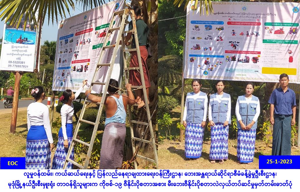 လူမှုဝန်ထမ်း၊ ကယ်ဆယ်ရေးနှင့် ပြန်လည်နေရာချထားရေးဝန်ကြီးဌာန၊ ဘေးအန္တရာယ်ဆိုင်ရာစီမံခန့်ခွဲမှု ဦးစီးဌာန၊ မုဒုံမြို့နယ်ဦးစီးမှူးရုံးမှ တာဝန်ရှိသူများသည် မုဒုံမြို့နယ်အတွင်းရှိ ပြည်သူလူထုများ သဘာဝ ဘေးအန္တရာယ်ရင်ဆိုင်ကြုံတွေ့လာပါက ထိခိုက်ဆုံးရှုံးမှုလျော့နည်းစေရေးနှင့် သဘာဝဘေးအသိပညာ များ တိုးပွားစေရန်အတွက် (၂၅-၁-၂၀၂၃)ရက်နေ့၊ နံနက်(၁၀း၀၀)နာရီ အချိန်တွင် မုဒုံမြို့နယ်၊ ကန်ကြီး ဘုရားရှေ့တွင် ယခင်စိုက်ထူထားသော (၉x၆)ပေ ကိုဗစ်-၁၉ ဗီနိုင်းပိုစတာအစား မီးဘေးဗီနိုင်းပိုစတာ အား လဲလှယ်တပ်ဆင်ခဲ့ပါကြောင်း သတင်းရရှိပါသည်။ Source: မုဒုံမြို့နယ်ဦးစီးမှူးရုံး(ဘစမ) #ar #mon_jan2023