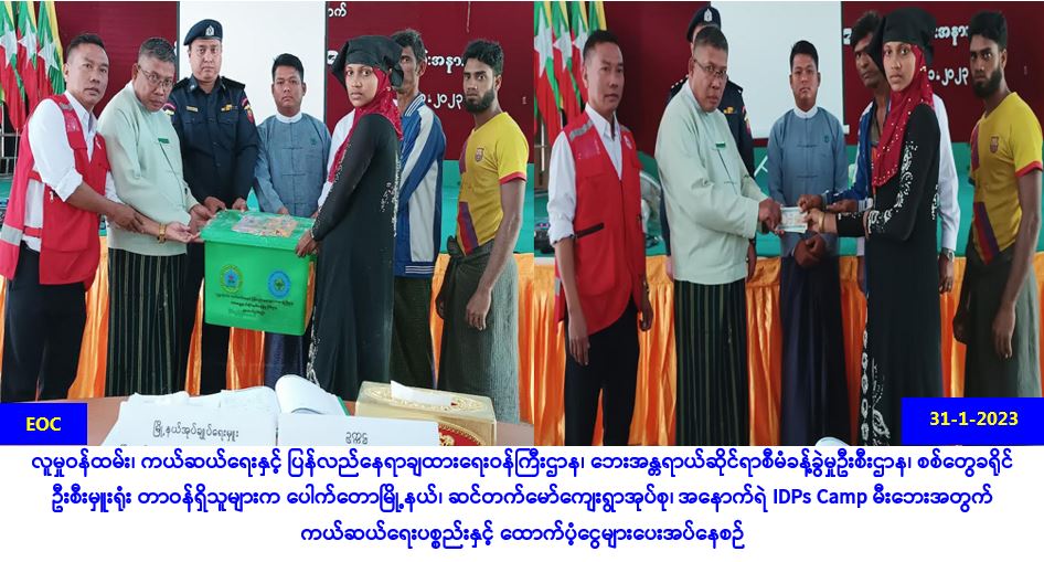 လူမှုဝန်ထမ်း၊ ကယ်ဆယ်ရေးနှင့် ပြန်လည်နေရာချထားရေးဝန်ကြီးဌာန၊ ဘေးအန္တရာယ်ဆိုင်ရာစီမံခန့်ခွဲမှုဦးစီးဌာန၊ စစ်တွေခရိုင်ဦးစီးမှူးရုံးမှ တာဝန်ရှိသူများသည် ရခိုင်ပြည်နယ်၊ စစ်တွေခရိုင်၊ ပေါက်တောမြို့နယ်၊ ဆင်တက်မော်ကျေးရွာအုပ်စု၊ အနောက်ရဲ IDPs Camp တွင် (၁၉-၁-၂၀၂၃) ရက်နေ့၌ ဖြစ်ပွားခဲ့သည့် မီးဘေးကြောင့် ဘေးသင့် (၁) အိမ်ထောင်စာအတွက် အိမ်ဆောက်ပစ္စည်းဖိုးထောက်ပံ့ငွေ (၁၀၀,၀၀၀/-)၊ လူဦးရေ (၂)ဦးအတွက် ဆန်ရိက္ခာဖိုးငွေ (၇)ရက်စာ (၄,၂၀၀/-)ကျပ်နှင့် ကယ်ဆယ်ရေးပစ္စည်း (၁၇)မျိုးပါ (၁)အိမ်ထောင်စာတို့အား (၃၁-၁-၂၀၂၃)ရက်နေ့၊ (၁၁:၃၀)နာရီအချိန်ခန့်တွင် ပေါက်တောမြို့နယ်အထွေထွေအုပ်ချုပ်ရေးဦးစီးဌာန အစည်းအဝေး ခန်းမ၌ ပေါက်တောမြို့နယ်စီမံအုပ်ချုပ်ရေးအဖွဲ့ဝင်များ၊ သက်ဆိုင်ရာကျေးရွာအုပ်ချုပ်ရေးမှူးနှင့်အတူ မီးဘေး သင့်ပြည်သူများ … Read more