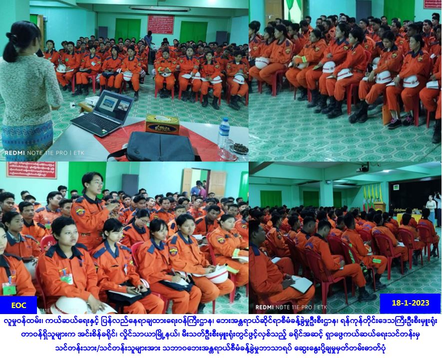 လူမှုဝန်ထမ်း၊ ကယ်ဆယ်ရေးနှင့် ပြန်လည်နေရာချထားရေးဝန်ကြီးဌာန၊ ဘေးအန္တရာယ်ဆိုင်ရာ စီမံခန့်ခွဲမှုဦးစီးဌာန၊ ရန်ကုန်တိုင်းဒေသကြီးဦးစီးမှူးရုံးမှ တာဝန်ရှိသူများသည် (၁၈-၁-၂၀၂၃) ရက် နေ့ (၁၂:၁၀) အချိန်မှ (၁၃:၄၀)နာရီအချိန်အထိ ရန်ကုန်တိုင်းဒေသကြီး၊ အင်းစိန်ခရိုင်၊ လှိုင်သာယာ မြို့နယ်၊ မီးသတ်ဦးစီးမှူးရုံးတွင်ဖွင့်လှစ်သည့် ခရိုင်အဆင့် ရှာဖွေကယ်ဆယ်ရေးသင်တန်း အမှတ်စဉ် (၄/၂၀၂၃)မှ သင်တန်းသား/သင်တန်းသူ စုစုပေါင်း (၁၀၀)ဦးတို့အား “သဘာဝဘေး အန္တရာယ်စီမံခန့်ခွဲမှုဘာသာရပ်” ကို ဆွေးနွေးပို့ချခဲ့ပါကြောင်း သတင်းရရှိပါသည်။ Source: ရန်ကုန်တိုင်းဒေသကြီးဦးစီးမှူးရုံး(ဘစမ) #ar #ygn_jan2023