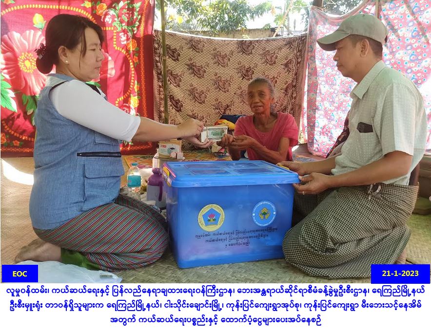 လူမှု၀န်ထမ်း၊ ကယ်ဆယ်ရေးနှင့် ပြန်လည်နေရာချထားရေး၀န်ကြီးဌာန၊ ဘေးအန္တရာယ်ဆိုင်ရာ စီမံခန့်ခွဲမှုဦးစီးဌာန၊ မြောင်းမြခရိုင်ဦးစီးမှူးရုံးမှ တာဝန်ရှိသူများသည် မြောင်းမြခရိုင်၊ အိမ်မဲ မြို့နယ်၊ ချောင်းဝပိုင်းရပ်ကွက်(၂)လမ်း၌ (၁၈-၁-၂၀၂၃) ရက်နေ့တွင် ဖြစ်ပွားခဲ့သော မီးလောင်မှု ကြောင့် မီးလောင်ကျွမ်းပျက်စီးနေအိမ်(၁)လုံး၊ အိမ်ထောင်စု(၁)စုမှ လူဦးရေ(၁)ဦးတို့အတွက် ကယ်ဆယ်ရေးပစ္စည်း(၁၇)မျိုးပါ (၁)ပုံး၊ အိမ်ဆောက်ပစ္စည်းရန်ပုံငွေ (၂၀၀,၀၀ဝ/-)၊ ဆန်ရိက္ခာဖိုး ရန်ပုံငွေ (၂,၁၀ဝ/-)၊ စုစုပေါင်းရန်ပုံငွေ(၂၀၂,၁၀ဝ/-)ကျပ်တို့အား (၁၉-၁-၂၀၂၃)ရက်နေ့၊ (၁၃:၀၀) နာရီအချိန်တွင် အိမ်မဲမြို့နယ်၊ အထွေထွေအုပ်ချုုပ်ရေးဦးစီးဌာနတွင် ဘေးသင့်ပြည်သူများထံသို့ ထောက်ပံ့ပေးအပ်ခဲ့ကြောင်း သတင်းရရှိပါသည်။ Source: မြောင်းမြခရိုင်ဦးစီးမှူးရုံး (ဘစမ) #ha_fir #ayy_jan2023
