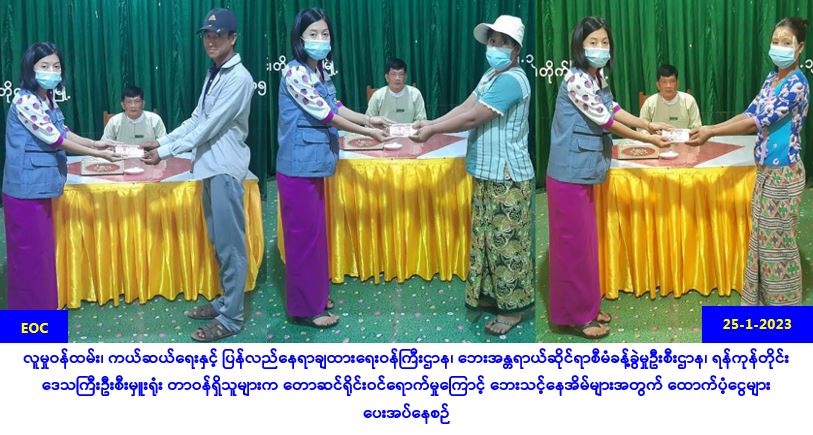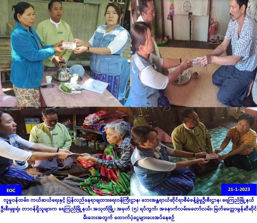 လူမှုဝန်ထမ်း၊ ကယ်ဆယ်ရေးနှင့် ပြန်လည်နေရာချထားရေးဝန်ကြီးဌာန၊ ဘေးအန္တရာယ်ဆိုင်ရာ စီမံခန့်ခွဲမှုဦးစီးဌာန၊ ရန်ကုန်တိုင်းဒေသကြီးဦးစီးမှူးရုံးမှ တာဝန်ရှိသူများသည် တိုက်ကြီးခရိုင်၊ တိုက်ကြီးမြို့နယ်၊ ဥက္ကံမြို့၊ ချောင်းစောက်ကျေးရွာအုပ်စု၊ မအူကုန်ကျေးရွာ၌ (၂၀-၁-၂၀၂၃) ရက် နေ့တွင် တောဆင်ရိုင်းဝင်ရောက်မှုကြောင့် တစ်စိတ်တစ်ပိုင်းပျက်စီးအိမ်ခြေ (၁)လုံးအတွက် အိမ်ဆောက်ပစ္စည်းဖိုးထောက်ပံ့ငွေ (၅၀,၀၀ဝ/-)၊ လူဦးရေ(၄)ဦးအတွက် ဆန်ရိက္ခာဖိုးထောက်ပံ့ ငွေ (၈,၄၀ဝ/-)ကျပ်နှင့် တိုက်ကြီးခရိုင်၊ တိုက်ကြီးမြို့နယ်၊ ချင်းကုန်းကျေးရွာအုပ်စု၊ ချင်းကုန်း ကျေးရွာ၌ (၂၂-၁-၂၀၂၃)ရက်နေ့တွင် တောဆင်ရိုင်းဝင်ရောက်မှုကြောင့် တစ်စိတ်တစ်ပိုင်း ပျက်စီး အိမ်ခြေ (၂)လုံးအတွက် အိမ်ဆောက်ပစ္စည်းဖိုးထောက်ပံ့ငွေ (၁၀၀,၀၀ဝ/-)၊ လူဦးရေ (၁၀)ဦး အတွက် … Read more