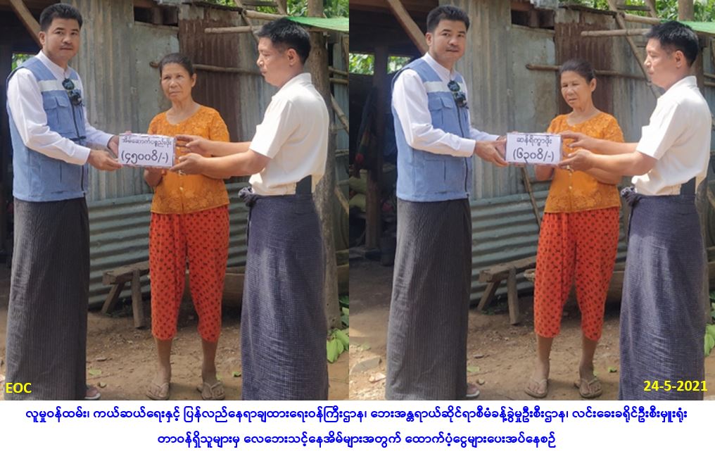 လူမှုဝန်ထမ်း၊ ကယ်ဆယ်ရေးနှင့် ပြန်လည်နေရာချထားရေးဝန်ကြီးဌာန၊ ဘေးအန္တရာယ်ဆိုင်ရာစီမံခန့်ခွဲမှုဦးစီးဌာန၊ လင်းခေး ခရိုင်ဦးစီးမှူးရုံးမှ တာဝန်ရှိသူများသည် လင်းခေးမြို့၊ တောင်ရွာရပ်ကွက်၌ (၂၃-၅-၂၀၂၁) ရက်နေ့၊ (၁၈:၀၀) နာရီအချိန်တွင် ဖြစ်ပွားခဲ့သော လေပြင်းတိုက်ခတ်မှုကြောင့် ဘေးသင့်လူနေအိမ် (၁) လုံးအတွက် အိမ်ဆောက်ပစ္စည်းဖိုးငွေ (၄၅,၀၀၀/-) ကျပ်နှင့် လူဦးရေ (၃) ဦးအတွက် ဆန်ရိက္ခာဖိုးငွေ (၇) ရက်စာ (၆,၃၀၀/-) ကျပ်၊ စုစုပေါင်း ထောက်ပံ့ငွေ (၅၁၃၀၀/-) ကျပ်တို့အား (၂၄-၅-၂၀၂၁) ရက်နေ့၊ (၁၀:၀၀) နာရီအချိန်တွင်လည်းကောင်း၊ မိုးနဲမြို့၊ ပေါ့မိုင်းရပ်ကွက်၌ (၂၃-၅-၂၀၂၁) … Read more
