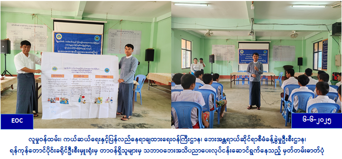 လူမှုဝန်ထမ်း၊ ကယ်ဆယ်ရေးနှင့် ပြန်လည်နေရာချထားရေးဝန်ကြီးဌာန၊ ဘေးအန္တရာယ်ဆိုင်ရာစီမံခန့်ခွဲမှု ဦးစီးဌာန၊ မြဝတီခရိုင်ဦးစီးမှူးရုံးမှ တာဝန်ရှိသူများသည် (၂၇-၁၁-၂၀၂၅)ရက်နေ့တွင် မြဝတီမြို့၊ အမှတ်(၅) ရပ်ကွက်၊ အောက်ဂျိုင့်၊ ကမ်းနားလမ်းတို့၌ သဘာဝဘေးအန္တရာယ်နှင့်စပ်လျဉ်း၍ ဆောင်ရန်/ ရှောင်ရန် အချက်များ လိုက်လံနှိုးဆော်ခဲ့ပြီး သဘာဝဘေးအသိပညာပေးလက်ကမ်းစာစောင်များ ဖြန့်ဝေပေးခဲ့ကြောင်း သတင်းရရှိပါသည်။ #ar #kyn_nov_2025 Source: မြဝတီခရိုင်ဦးစီးမှူးရုံး