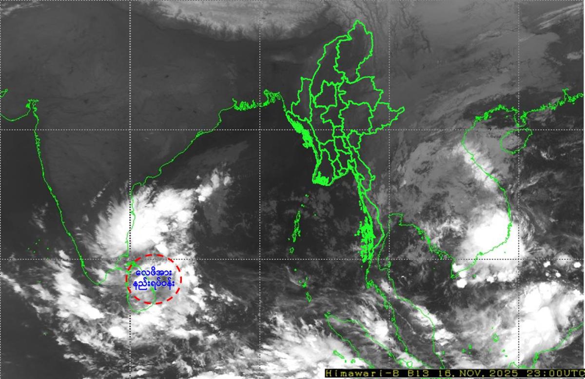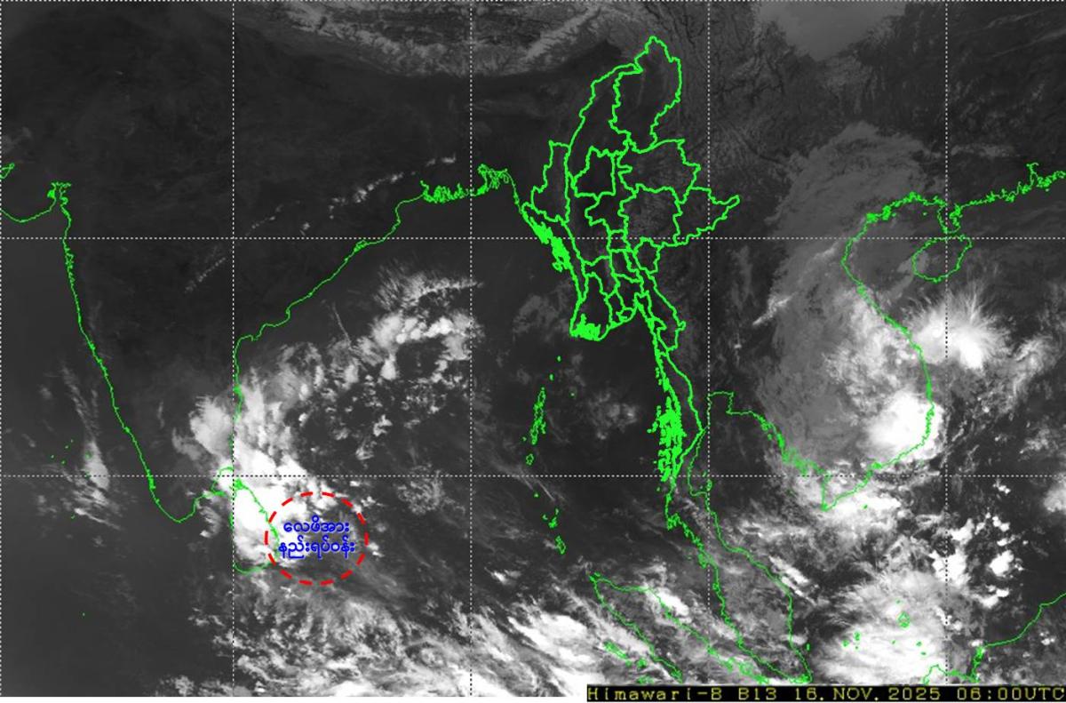 ၂၀၂၅ ခုနှစ်၊ နိုဝင်ဘာလ ၁၆ ရက်နေ့ မြန်မာစံတော်ချိန် (၁၄:၀၀) နာရီအချိန်တွင် မိုးလေဝသနှင့် ဇလဗေဒ ညွှန်ကြားမှုဦးစီးဌာနမှ “လေဖိအားနည်းရပ်ဝန်းအခြေအနေသတင်း”ကို အောက်ပါအတိုင်း ထုတ်ပြန်ထားပါသည်- လေဖိအားနည်းရပ်ဝန်းအခြေအနေသတင်း ယနေ့မြန်မာစံတော်ချိန် ၁၂:၃၀ နာရီအချိန် တိုင်းထွာချက်များအရ ဘင်္ဂလားပင်လယ်အော် အနောက် တောင်ပိုင်း (သီရိလင်္ကာနိုင်ငံကမ်းလွန်)တွင် လေဖိအားနည်းရပ်ဝန်း (Low Pressure Area) တစ်ခု ဖြစ်ပေါ်နေပါသည်။ အဆိုပါ လေဖိအားနည်းရပ်ဝန်းသည် နောက် ၂၄ နာရီအတွင်း အနောက်-အနောက်မြောက်ဘက်သို့ ဖြည်းညှင်းစွာ ရွေ့လျားနိုင်သည်ဟု ခန့်မှန်းရပါသည်။