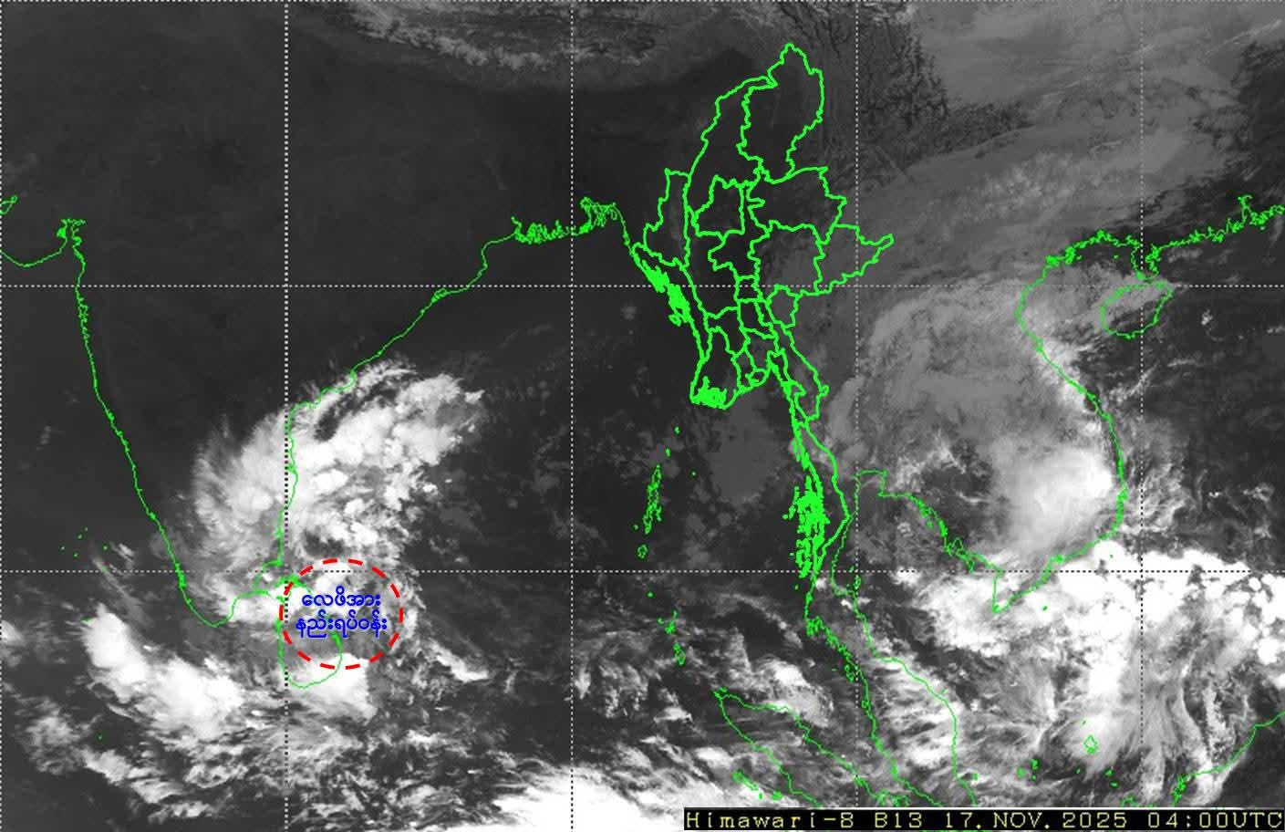 ၂၀၂၅ ခုနှစ်၊ နိုဝင်ဘာလ ၁၇ ရက်နေ့ မြန်မာစံတော်ချိန် (၁၂:၀၀) နာရီအချိန်တွင် မိုးလေဝသနှင့် ဇလဗေဒညွှန်ကြားမှုဦးစီးဌာနမှ “လေဖိအားနည်းရပ်ဝန်းအခြေအနေသတင်း”ကိုအောက်ပါအတိုင်း ထုတ်ပြန် ထားပါသည်- လေဖိအားနည်းရပ်ဝန်းအခြေအနေ ယနေ့မြန်မာစံတော်ချိန် ၁၀:၃၀ နာရီအချိန် တိုင်းထွာချက်များအရ ဘင်္ဂလားပင်လယ်အော် အနောက်တောင်ပိုင်းနှင့် ယင်းနှင့်ဆက်စပ်လျက်ရှိသော သီရိလင်္ကာနိုင်ငံကမ်းရိုးတန်းတွင် ဖြစ်ပေါ် နေသော လေဖိအားနည်းရပ်ဝန်း (Low Pressure Area) သည် ဆက်လက်တည်ရှိနေပါသည်။ အဆိုပါ လေဖိအားနည်းရပ်ဝန်းသည် နောက် ၂၄ နာရီအတွင်း အနောက်-အနောက်မြောက်ဘက်သို့ ဖြည်းညှင်းစွာ ရွေ့လျားနိုင်သည်ဟု ခန့်မှန်းရပါသည်။