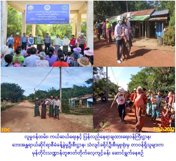 လူမှုဝန်ထမ်း၊ ကယ်ဆယ်ရေးနှင့် ပြန်လည်နေရာချထားရေးဝန်ကြီးဌာန၊ ဘေးအန္တရာယ်ဆိုင်ရာစီမံခန့်ခွဲမှုဦးစီးဌာန၊ သထုံခရိုင်ဦးစီးမှူးရုံးမှ တာဝန်ရှိသူများသည် ခရိုင်လူမှုဝန်ထမ်းဦးစီးဌာနနှင့်ပူးပေါင်း၍ (၁၄-၁၂-၂၀၂၂) ရက်နေ့၊ (၁၄း၀၀)နာရီအချိန်မှ (၁၅း၃၀)နာရီအချိန် ထိမွန်ပြည်နယ်၊ သထုံခရိုင်၊ သထုံ မြို့နယ်၊ သိမ်ကုန်းရပ်ကွက်၊ အ.ထ.က(၄) သထုံရှိ ကျောင်းသား/သူအင်အား(၁၀၀)ဦးခန့်အား သဘာဝဘေးအန္တရာယ်ဆိုင်ရာအသိပညာပေးနှင့်ပတ်သက်၍ သိရှိလိုက်နာဆောင်ရွက်ရမည့် ဆောင်ရန်/ ရှောင်ရန်အချက်များအားဟောပြောဆွေးနွေးခြင်း၊ လက်ကမ်းစာစောင်ဖြန့်ဝေခြင်းနှင့် ဗီနိုင်းပိုစတာဖြန့်ဝေခြင်းတို့အား ဆောင်ရွက်ခဲ့ပါကြောင်း သတင်းရရှိပါသည်။ Source: သထုံခရိုင်ဦးစီးမှူးရုံး (ဘစမ) #ar #mon_dec2022