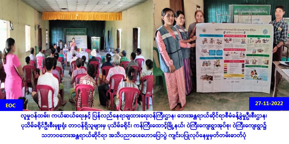 လူမှု၀န်ထမ်း၊ ကယ်ဆယ်ရေးနှင့် ပြန်လည်နေရာချထားရေး၀န်ကြီးဌာန၊ ဘေးအန္တရာယ်ဆိုင်ရာစီမံခန့်ခွဲမှု ဦးစီးဌာန၊ ပုသိမ်ခရိုင်ဦးစီးမှူးရုံးမှတာ၀န်ရှိသူများသည် ဧရာ၀တီတိုင်းဒေသကြီး လူမှု၀န်ထမ်းဦးစီးဌာန နှင့်ပူးပေါင်း၍ (၂၇-၁၁-၂၀၂၂)ရက်နေ့တွင် ပုသိမ်ခရိုင်၊ ကန်ကြီးထောင့်မြို့နယ်၊ ၀ဲကြီးကျေးရွာအုပ်စု၊ ၀ဲကြီးကျေးရွာရှိ ရွာသူ/သား (၆၀)ဦးခန့်အား ဦးစီးဌာန၏ လုပ်ငန်းများ၊ ထောက်ပံ့ဆောင်ရွက်နေမှုများ၊ သဘာ၀ဘေးနှင့်ပတ်သက်သော အသိပညာဗဟုသုတများနှင့် ဆောင်ရန်/ရှောင်ရန်များအား အသိပညာပေးဆွေးနွေးပြောကြားခဲ့ပြီး မုန်တိုင်းဘေးအသိပညာပေးဗီနိုင်းနှင့် လက်ကမ်းစာစောင်များဖြန့်ဝေပေးခဲ့ ပါအကြောင်း သတင်းရရှိပါသည်။ #ar #ayy_Nov2022 Source: ပုသိမ်ခရိုင်ဦးစီးမှူးရုံး(ဘစမ)