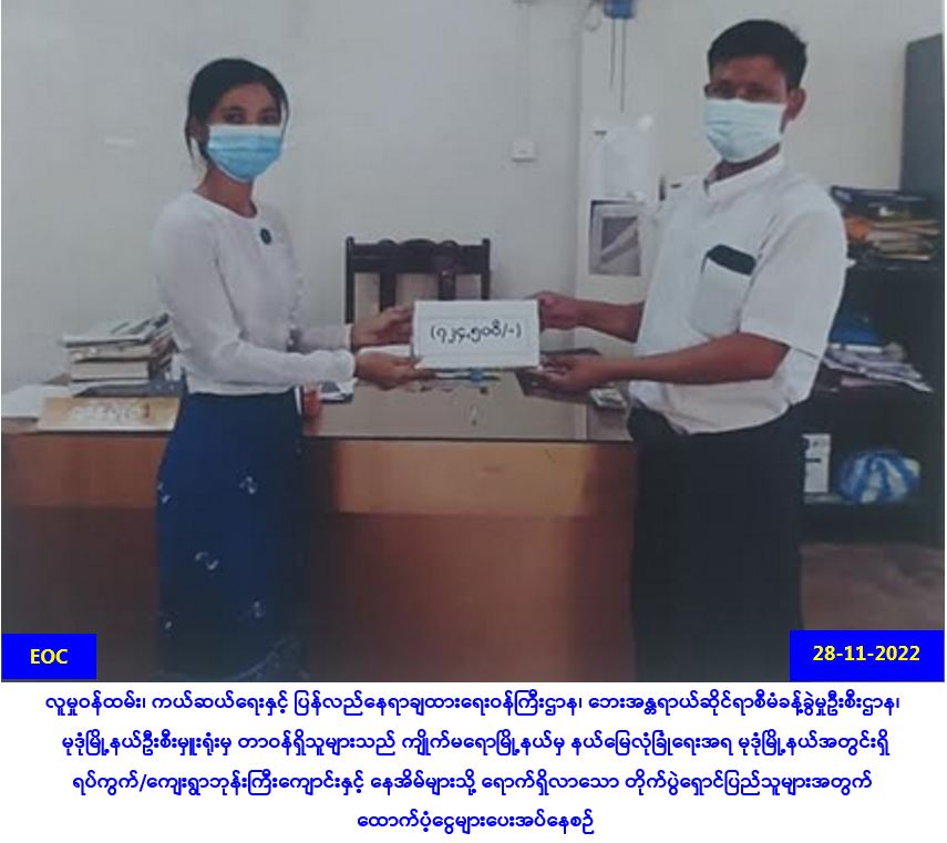 လူမှုဝန်ထမ်း၊ ကယ်ဆယ်ရေးနှင့် ပြန်လည်နေရာချထားရေးဝန်ကြီးဌာန၊ ဘေးအန္တရာယ်ဆိုင်ရာစီမံခန့်ခွဲမှု ဦးစီးဌာန၊ မုဒုံမြို့နယ်ဦးစီးမှူးရုံးမှ တာဝန်ရှိသူများသည် (၂၃-၁၁-၂၀၂၂) ရက်နေ့တွင် ကျိုက်မရောမြို့နယ် မှ နယ်မြေလုံခြုံရေးအရ မုဒုံမြို့နယ်အတွင်းရှိ ရပ်ကွက်/ကျေးရွာဘုန်းကြီးကျောင်းနှင့် နေအိမ်များသို့ ရောက်ရှိလာသော တိုက်ပွဲရှောင်ပြည်သူ (၃၄၅) ဦးအတွက် ဆန်ရိက္ခာဖိုးငွေ (၇) ရက်စာ (၇၂၄,၅၀၀/-) ကျပ်တို့အား (၂၈-၁၁-၂၀၂၂) ရက်နေ့၊ (၁၄:၃၀) နာရီ အချိန်တွင် သွားရောက်ထောက်ပံ့ပေးအပ်ခဲ့ကြောင်း သတင်းရရှိပါသည်။ #otr #mon_Nov2022 Source: မုဒုံမြို့နယ်ဦးစီးမှူးရုံး(ဘစမ)