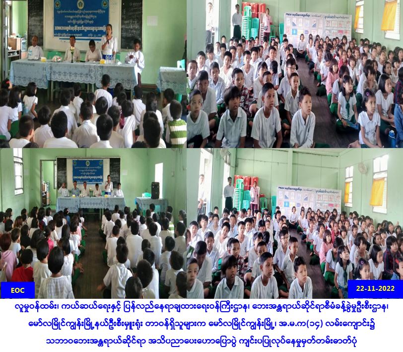လူမှု၀န်ထမ်း၊ ကယ်ဆယ်ရေးနှင့် ပြန်လည်နေရာချထားရေး၀န်ကြီးဌာန၊ ဘေးအန္တရာယ်ဆိုင်ရာစီမံခန့်ခွဲမှု ဦးစီးဌာန၊ ပုသိမ်ခရိုင်ဦးစီးမှူးရုံးမှတာ၀န်ရှိသူများသည် လူမှု၀န်ထမ်းဦးစီးဌာနနှင့်ပူးပေါင်း၍ (၂၂-၁၁-၂၀၂၂) ရက်နေ့တွင် ပုသိမ်ခရိုင်၊ ပုသိမ်မြို့နယ်၊ (အ.လ.က -၄)မြက်တို၊ အလယ်တန်းကျောင်းခွဲရှိ ကျောင်းသား/သူ (၁၅၀)ဦးခန့်တို့အား ဦးစီးဌာန၏ လုပ်ငန်းဆောင်ရွက်ချက်များ၊ ထောက်ပံ့ဆောင်ရွက်နေမှုများ၊ သဘာ၀ဘေးအန္တရာယ်နှင့်ပတ်သက်သော အသိပညာဗဟုသုတများနှင့် ဆောင်ရန်/ရှောင်ရန် များအား အသိပညာပေးဆွေးနွေးပြောကြားခဲ့ပြီး မီးဘေးအသိပညာပေးဗီနိုင်းနှင့် လက်ကမ်းစာစောင်များ ဖြန့်ဝေပေးခဲ့ပါကြောင်း သတင်းရရှိပါသည်။ #ar #ayy_Nov2022 Source: ပုသိမ်ခရိုင်ဦးစီးမှူးရုံး(ဘစမ)