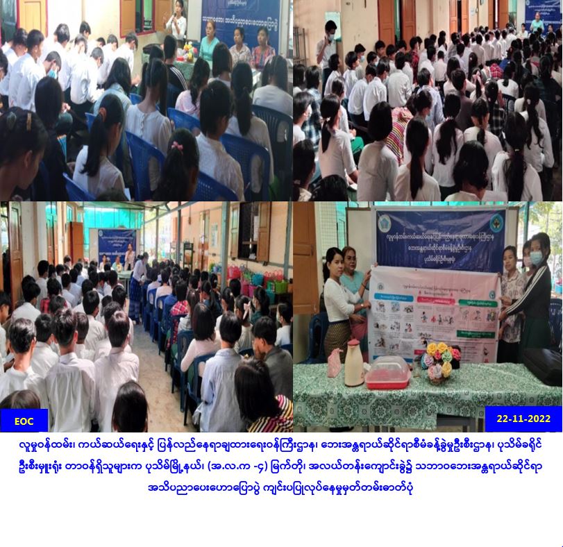 လူမှုဝန်ထမ်း၊ ကယ်ဆယ်ရေးနှင့် ပြန်လည်နေရာချထားရေးဝန်ကြီးဌာန၊ ဘေးအန္တရာယ်ဆိုင်ရာစီမံခန့်ခွဲမှုဦးစီးဌာန၊ ရန်ကုန်တောင်ပိုင်းခရိုင်ဦးစီးမှူးရုံး(သန်လျင်) မှ တာဝန်ရှိသူများသည် Quick-Win Project အစီအစဉ်ဖြင့် လူမှုဝန်ထမ်းဦးစီးဌာန၊ ပြန်လည်ထူထောင်ရေးဦးစီးဌာနတို့နှင့်ပူးပေါင်း၍ (၂၄-၁၁-၂၀၂၂) ရက်နေ့တွင် ရန်ကုန်တိုင်းဒေသကြီး၊ သန်လျင်ခရိုင်၊ သုံးခွမြို့နယ်၊ အမှတ်(၁)အခြေခံပညာအထက်တန်းကျောင်း၌ ဆရာ၊ ဆရာမများနှင့် ကျောင်းသား၊ ကျောင်းသူများအား သဘာဝဘေးအသိပညာများ ဆွေးနွေးဟောပြောခြင်း၊ သဘာ၀ဘေးအသိပညာပေး Video Click ပြသခြင်းများ ဆောင်ရွက်ခဲ့ပြီး အသိပညာပေးလက်ကမ်းစာစောင်များနှင့် ဗီနိုင်းများ ဖြန့်ဝေပေးခြင်းတို့ ဆောင်ရွက်ခဲ့ကြောင်း သတင်းရရှိပါသည်။ #ar #ygn_nov2022 Source: ရန်ကုန်တောင်ပိုင်းခရိုင်ဦးစီးမှူးရုံး (ဘစမ)