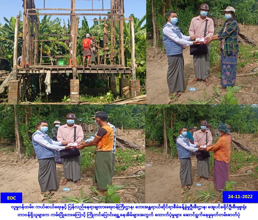 လူမှု၀န်ထမ်း၊ ကယ်ဆယ်ရေးနှင့် ပြန်လည်နေရာချထားရေး၀န်ကြီးဌာန၊ ဘေးအန္တရာယ်ဆိုင်ရာစီမံခန့်ခွဲမှု ဦးစီးဌာန၊ မအူပင်ခရိုင်ဦးစီးမှူးရုံးမှ တာဝန်ရှိသူများသည် ဧရာဝတီတိုင်းဒေသကြီး၊ မအူပင်ခရိုင်၊ ပန်းတနော်မြို့နယ်၊ ဘဝိုင်းကျေးရွာအုပ်စု၊ မြင်းကဒေါင်ကျေးရွာ၌ (၂၃-၁၁-၂၀၂၂)ရက်နေ့တွင် ဖြစ်ပွား ခဲ့သော ကမ်းပြိုဘေးကြောင့် ကြိုတင်ဖျက်သိမ်း ပြောင်းရွှေ့ခဲ့သည့် နေအိမ် (၅)လုံး၊ အိမ်ထောင်စု(၅)စုမှ လူဦးရေ(၁၇)ဦးအတွက် အိမ်ဆောက်ပစ္စည်းဖိုး ရန်ပုံငွေ (၅၀၀,၀၀ဝ/-)၊ ဆန်ရိက္ခာ (၇) ရက်စာဖိုး ရန်ပုံငွေ (၃၅,၇၀ဝ/-)၊ စုစုပေါင်း ကယ်ဆယ်ရေးရန်ပုံငွေ (၅၃၅,၇၀ဝ/-)နှင့် ကာဘော်လိပ်ဆပ်ပြာ (၅)တောင့်တို့ အား (၂၄-၁၁-၂၀၂၂)ရက်နေ့၊ (၁၃:၃၀)နာရီအချိန်တွင် ကမ်းပြိုဘေးသင့်ပြည်သူများလက်ဝယ်အရောက် ကွင်းဆင်းထောက်ပံ့ပေးအပ်ခဲ့ကြောင်း … Read more