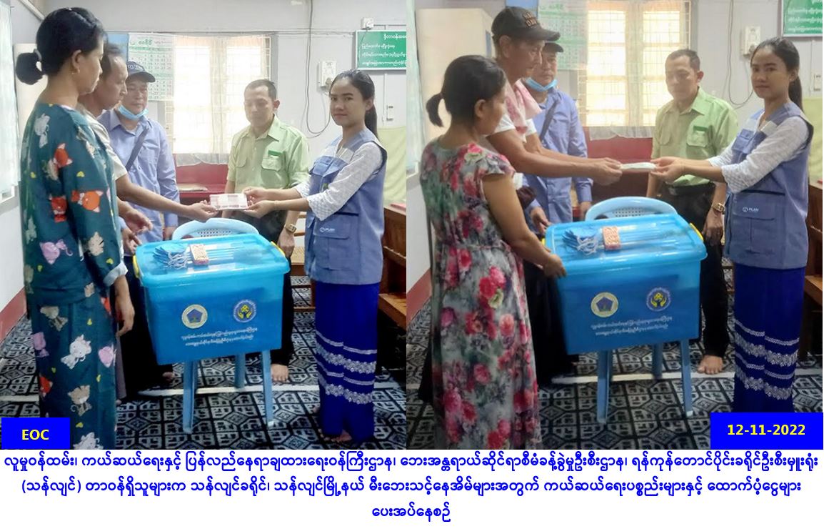 လူမှုဝန်ထမ်း၊ ကယ်ဆယ်ရေးနှင့် ပြန်လည်နေရာချထားရေးဝန်ကြီးဌာန၊ ဘေးအန္တရာယ်ဆိုင်ရာစီမံခန့်ခွဲမှု ဦးစီးဌာန၊ ရန်ကုန်တောင်ပိုင်းခရိုင်ဦးစီးမှူးရုံး(သန်လျင်) မှ တာဝန်ရှိသူများသည် သန်လျင်ခရိုင်၊ သန်လျင်မြို့နယ်၊ အမှုထမ်းရပ်ကွက်၊ စိုက်ပျိုးရေးလမ်း၊ ဦးရွှေရိုးလမ်းသွယ်အတွင်း (၁၁-၁၁-၂၀၂၂) ရက်နေ့၌ နေအိမ်ဘုရားစင်တွင် အမွှေးတိုင်မီးပူဇော်ရာမှ မီးလောင်မှုဖြစ်ပွားခဲ့ရာ အဆိုပါ မီးလောင်မှုကြောင့် လုံးဝပျက်စီးအိမ်ထောင်စု (၂) စုအတွက် အိမ်ဆောက်ပစ္စည်းဖိုးထောက်ပံ့ငွေ (၄၀၀,၀၀၀/-) ကျပ်၊ လူဦးရေ (၈) ဦးအတွက် ဆန်ရိက္ခာဖိုးငွေ (၁၆,၈၀၀/-) ကျပ်နှင့် ကယ်ဆယ်ရေးပစ္စည်း (၂) အိမ်ထောင်စာတို့အား (၁၂-၁၁-၂၀၂၂) ရက်နေ့၊ (၁၀:၀၀) နာရီအချိန်တွင် သန်လျင်မြို့နယ်၊ … Read more