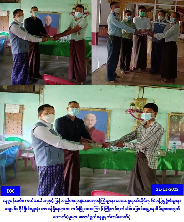 လူမှုဝန်ထမ်း၊ ကယ်ဆယ်ရေးနှင့် ပြန်လည်နေရာချထားရေးဝန်ကြီးဌာန၊ ဘေးအန္တရာယ်ဆိုင်ရာစီမံခန့်ခွဲမှု ဦးစီးဌာန၊ မအူပင်ခရိုင်ဦးစီးမှူးရုံးမှ တာဝန်ရှိသူများသည် ဧရာဝတီတိုင်းဒေသကြီး၊ မအူပင်ခရိုင်၊ ပန်းတနော်မြို့နယ်၊ တောကျောင်းကျေးရွာအုပ်စု၊ (ပေါက်ချောင်း၊ ကျောင်းတော်ကလေး၊ တောကျောင်း အထက်နှင့် နံဂါတ်ရိုး)ကျေးရွာတို့၌ (၁၉-၁၁-၂၀၂၂) ရက်နေ့တွင် ဖြစ်ပွားခဲ့သော ကမ်းပြိုဘေးကြောင့် ကြိုတင်ဖျက်သိမ်းပြောင်းရွှေ့ခဲ့သည့် နေအိမ် (၁၅)လုံး၊ အိမ်ထောင်စု (၁၅)စုမှ လူဦးရေ (၅၉)ဦးတို့အတွက် အိမ်ဆောက်ပစ္စည်းဖိုးရန်ပုံငွေ (၁,၅၀၀,၀၀ဝ/-)၊ ဆန်ရိက္ခာ (၇) ရက်စာ ရန်ပုံငွေ (၁၂၃,၉၀ဝ/-)၊ စုစုပေါင်း ကယ်ဆယ်ရေးရန်ပုံငွေ (၁,၆၂၃,၉၀ဝ/-)နှင့် ကာဘော်လိပ်ဆပ်ပြာ(၁၅)တောင့်တို့အား(၂၁-၁၁-၂၀၂၂) ရက်နေ့၊ (၁၅:၀၀)နာရီအချိန်တွင်လည်းကောင်း၊ … Read more