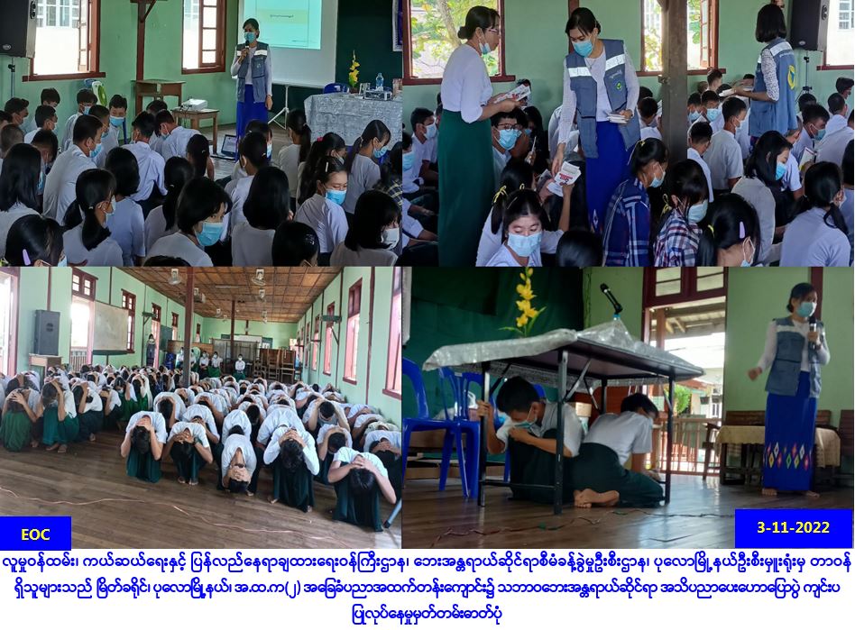 လူမှုဝန်ထမ်း၊ ကယ်ဆယ်ရေးနှင့် ပြန်လည်နေရာချထားရေးဝန်ကြီးဌာန၊ ဘေးအန္တရာယ်ဆိုင်ရာစီမံခန့်ခွဲမှု ဦးစီးဌာန၊ ပုလောမြို့နယ်ဦးစီးမှူးရုံးမှ တာဝန်ရှိသူများသည် (၃-၁၁-၂၀၂၂) ရက်နေ့၊ နံနက် (၀၉:၃၀) အချိန်တွင် လူမှုဝန်ထမ်းဦးစီးဌာနနှင့်ပူးပေါင်းပြုလုပ်သော (Quick – Win Project) ၌ မြိတ်ခရိုင်၊ ပုလောမြို့နယ်၊ အ.ထ.က(၂)အခြေခံပညာအထက်တန်းကျောင်းတွင် ကျောင်းသား/သူ (၁၂၀) ဦးတို့အား သဘာဝဘေးအန္တရာယ်များနှင့်ပတ်သက်၍ အသိပညာပေးဟောပြောခြင်း၊ လက်ကမ်းစာစောင်များ ဖြန့်ဝေပေးခြင်း၊ ဘောလ်ပင်များဝေငှပေးခြင်းနှင့် ဗွီနိုင်းပိုစတာပေးအပ်ခြင်းများ ဆောင်ရွက်ခဲ့ပါကြောင်း သတင်းရရှိပါသည်။ #ar #tny_Nov2022 Source: ပုလောမြို့နယ်ဦးစီးမှူးရုံး(ဘစမ)