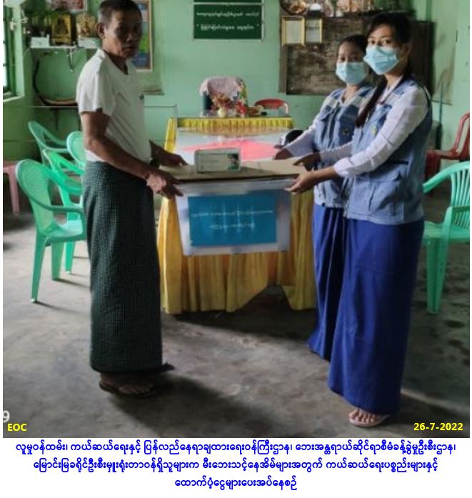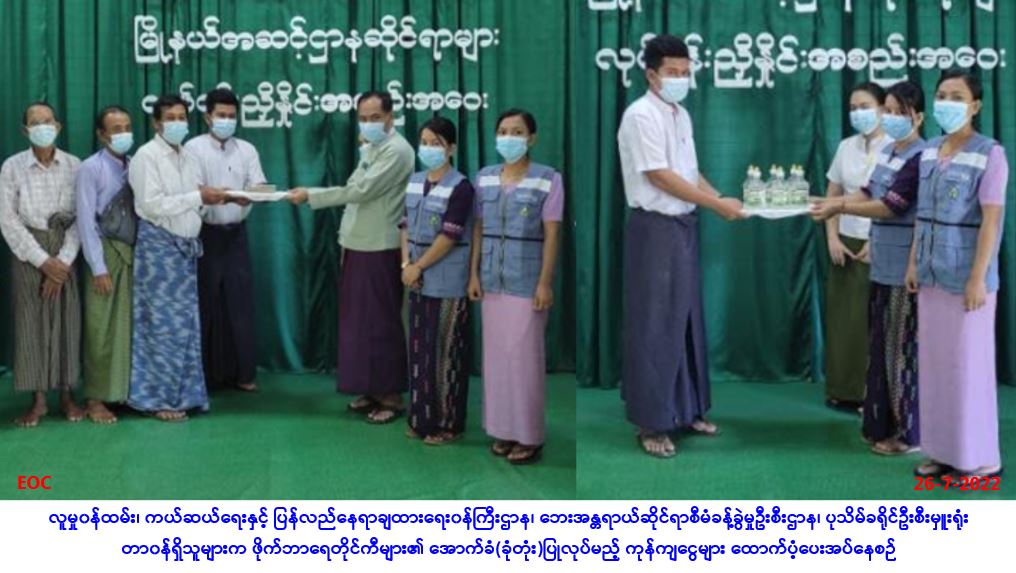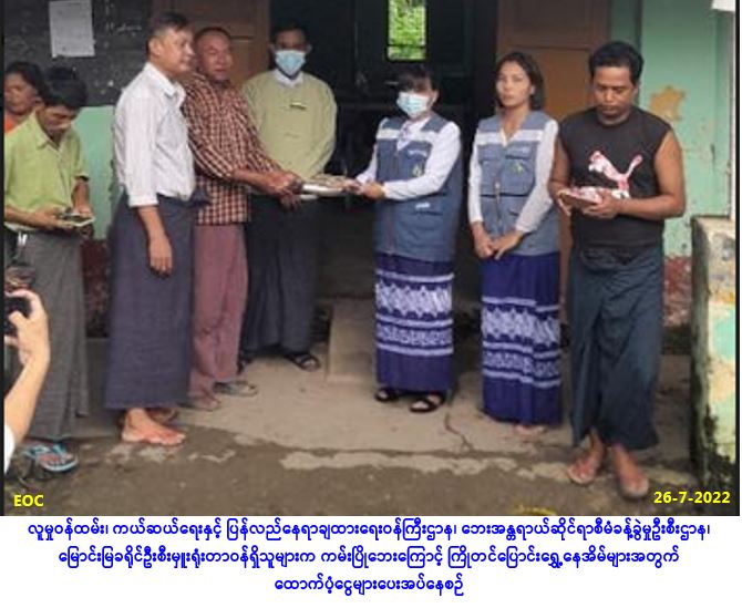 လူမှုဝန်ထမ်း၊ ကယ်ဆယ်ရေးနှင့် ပြန်လည်နေရာချထားရေးဝန်ကြီးဌာန၊ ဘေးအန္တရာယ်ဆိုင်ရာစီမံခန့်ခွဲမှု ဦးစီးဌာန၊မြောင်းမြခရိုင်ဦးစီးမှူးရုံးမှ တာဝန်ရှိသူများသည် မြောင်းမြခရိုင်၊ မြောင်းမြမြို့နယ်၊ အမှတ် (၉)ရပ်ကွက်၊ ရိပ်သာလမ်းထောင့်နှင့် ဂေါ်ဖီခြံ(၄)လမ်းထောင့်တွင် (၂၆-၇-၂၀၂၂)ရက်နေ့၌ ဖြစ်ပွားခဲ့သော မီးဘေးကြောင့် မီးဘေးသင့်ခဲ့သော နေအိမ်(၃)လုံးအတွက် ကယ်ဆယ်ရေးပစ္စည်း(၁၇)မျိုး၊ အိမ်ထောင်စု (၂) စုစာ၊ ကယ်ဆယ်ရေးပစ္စည်း (၁၈)မျိုး၊ အိမ်ထောင်စု(၁)စုစာ၊ အိမ်ဆောက်ပစ္စည်းဖိုးထောက်ပံ့ငွေ (၄၀၀,၀၀ဝ/-)၊ လူဦးရေ (၂၁)ဦးတို့အတွက် Mask (၄၂)ခု၊ ဆန်ရိက္ခာဖိုးထောက်ပံ့ငွေ (၄၄,၁၀ဝ/-)ကျပ်၊ စုစုပေါင်းထောက်ပံ့ငွေ (၄၄၄,၁၀ဝ/-)ကျပ်တို့အား (၂၆-၇-၂၀၂၂)ရက်နေ့၊ (၁၄:၀၀)နာရီအချိန် တွင် မြောင်းမြမြို့နယ်၊ အမှတ်(၉)ရပ်ကွက်၊ အုပ်ချုပ်ရေးမှူးရုံးတွင် ဘေးသင့်ပြည်သူများထံ … Read more