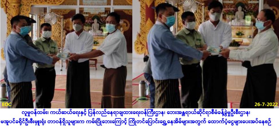 လူမှုဝန်ထမ်း၊ ကယ်ဆယ်ရေးနှင့် ပြန်လည်နေရာချထားရေးဝန်ကြီးဌာန၊ ဘေးအန္တရာယ်ဆိုင်ရာစီမံခန့်ခွဲမှု ဦးစီးဌာန၊ မအူပင်ခရိုင်ဦးစီးမှူးရုံးမှ တာဝန်ရှိသူများသည် ဧရာဝတီတိုင်းဒေသကြီး၊ မအူပင်ခရိုင်၊ ပန်းတနော်မြို့နယ်၊ တောကျောင်းကျေးရွာအုပ်စုနှင့် ကဿ၀င်ကျေးရွာအုပ်စုတို့၌ (၂၆-၇-၂၀၂၂) ရက်နေ့ တွင် ဖြစ်ပွားခဲ့သော ကမ်းပြိုဘေးကြောင့် ကြိုတင်ဖျက်သိမ်းပြောင်းရွှေ့ခဲ့သည့် နေအိမ် (၃၃)လုံး၊ အိမ်ထောင်စု (၃၃)စုမှ လူဦးရေ (၁၈၉)ဦးအတွက် ဆန်ရိက္ခာဖိုးထောက်ပံ့ငွေ (၇)ရက်စာ (၃၉၆,၉၀ဝ/-)၊ အိမ်ဆောက်ပစ္စည်းဖိုးထောက်ပံ့ငွေ (၃,၃၀၀,၀၀ဝ/-)၊ စုစုပေါင်းထောက်ပံ့ငွေ (၃,၆၉၆,၉၀ဝ/-) ကျပ်တို့ အား(၂၆-၇-၂၀၂၂)ရက်နေ့၊ (၁၅း၃၀)မှ(၁၆း၃၀)ချိန်ထိ ပန်းတနော်မြို့နယ်စီမံအုပ်ချုပ်ရေး အဖွဲ့ဥက္ကဋ္ဌ၊ အဖွဲ့၀င်များနှင့်အတူဘေးသင့်ပြည်သူများလက်ဝယ်အရောက် ကွင်းဆင်းထောက်ပံ့ပေးအပ်ခဲ့ကြောင်း သတင်းရရှိပါသည်။ #ha_rbe … Read more