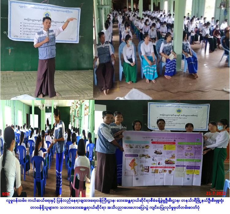 (၂၂.၇.၂၀၂၂)ရက်နေ့တွင် လူမှုဝန်ထမ်း၊ ကယ်ဆယ်ရေးနှင့်ပြန်လည်နေရာချထားရေး ဝန်ကြီးဌာန၊ ဘေးအန္တရာယ် ဆိုင်ရာစီမံခန့်ခွဲမှုဦးစီးဌာန၊ မော်လမြိုင်ကျွန်းမြို့နယ်ဦးစီးမှူးရုံးမှ တာ၀န်ရှိသူများသည် လူမှုဝန်ထမ်းဦးစီးဌာနနှင့်ပူးပေါင်း၍ မော်လမြိုင်ကျွန်းမြို့၊ အမှတ်(၁) အခြေခံပညာအထက်တန်းကျောင်း၌ ကျောင်းသား/သူ(၂၀၀)ဦးအား ကြိုတင်ကာကွယ် သဘာ၀ဘေးအန္တရာယ်ခေါင်းစဉ်ဖြင့် အသိပညာပေးဟောပြောပွဲပြုလုပ်ခဲ့ပြီး လက်ကမ်း စာစောင်များ ဖြန့်ဝေခဲ့ကြောင်း သတင်းရရှိပါသည်။ #ar #ayy_july2022 Source: မော်လမြိုင်ကျွန်းမြို့နယ်ဦးစီးမှူးရုံး(ဘစမ)