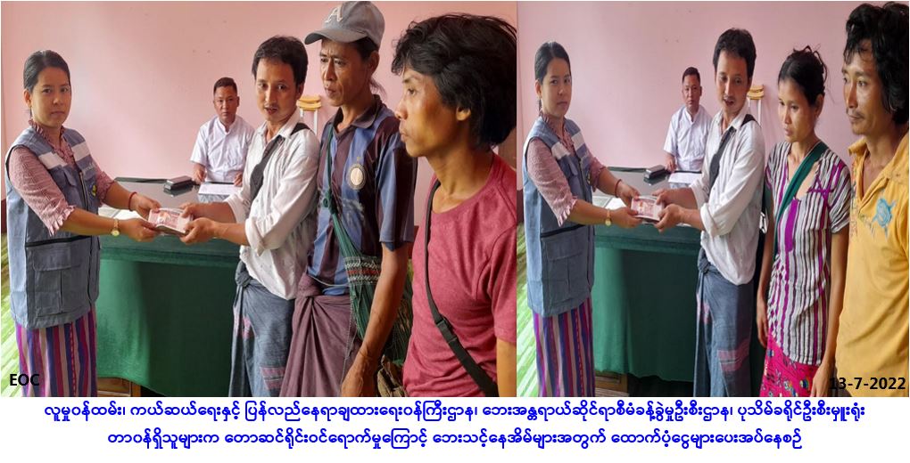 လူမှုဝန်ထမ်း၊ ကယ်ဆယ်ရေးနှင့်ပြန်လည်နေရာချထားရေးဝန်ကြီးဌာန၊ ဘေးအန္တရာယ်ဆိုင်ရာစီမံခန့်ခွဲမှုဦးစီးဌာန၊ မြိတ်ခရိုင်ဦးစီးမှူးရုံးမှ တာဝန်ရှိသူများသည် (၁၂.၇.၂၀၂၂) ရက်နေ့တွင် မြိတ်မြို့နယ်၊ ကဟန်း ကျေးရွာအုပ်စု၊ ကဟန်းကျေးရွာတွင် ဖြစ်ပွားခဲ့သော လေဘေး၌ မိုးသည်းထန်စွာရွာသွန်းပြီး လေပြင်းတိုက်ခတ်မှုကြောင့် လေဘေးသင့် လုံးဝပျက်စီးနေအိမ် (၁)လုံးအတွက် အိမ်ဆောက်ပစ္စည်းဖိုး (၁၀၀,၀၀ဝ/-) ကျပ်၊ ဘေးသင့်အိမ်ထောင်စု(၁)စုမှ လူဦးရေ (၉)ဦး အတွက် (၇)ရက်စာဆန်ရိက္ခာဖိုး (၁၈,၉၀ဝ/-)ကျပ်၊ စုစုပေါင်း ထောက်ပံ့ငွေ (၁၁၈,၉၀၀/-)ကျပ်၊ လေဘေးသင့်အိမ်ထောင်စု (၁) စုအတွက် (၄၆၀၃၆/-) ကျပ် တန်ဖိုးရှိ ကယ်ဆယ်ရေးပစ္စည်း (၁၇)မျိုး(၁)ပုံး၊ အ.မ.က ကျောင်းသား(၁)ဦးနှင့် … Read more