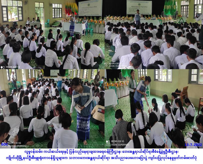 လူမှုဝန်ထမ်း၊ ကယ်ဆယ်ရေးနှင့် ပြန်လည်နေရာချထားရေးဝန်ကြီးဌာန၊ ဘေးအန္တရာယ်ဆိုင်ရာစီမံခန့်ခွဲမှု ဦးစီးဌာန၊ ကျိုက်ထိုမြို့နယ်ဦးစီးမှူးရုံးမှတာဝန်ရှိသူများသည် (၁၃-၇-၂၀၂၂)ရက်နေ့တွင် လူမှုဝန်ထမ်း ဦးစီးဌာနနှင့်ပူးပေါင်း၍ ကျိုက်ထိုမြို့ အ.ထ.က(၂)စာသင်ကျောင်းတွင် ပညာသင်ကြားနေသော ကျောင်းသား/ကျောင်းသူ (၂၀၀)ဦးတို့အား သဘာဝဘေးအသိပညာဗဟုသုတတိုးပွားစရန် ရည်ရွယ်၍ ကြိုတင်ကာကွယ်ခြင်း၊ ကြိုတင်ပြင်ဆင်ခြင်း၊ တုံ့ပြန်ခြင်းဆိုင်ရာ အသိပညာပေးခြင်းတို့ကို (၁ဝး၀၀) နာရီ အချိန်မှ (၁၂း၀၀)နာရီအချိန်ထိ ဟောပြောဆွေးနွေးခြင်းနှင့် လက်ကမ်းစာစောင်ဝေငှခြင်းတို့အား ဆောင်ရွက်ခဲ့ပါကြောင်း သတင်းရရှိပါသည်။ #ar #mon_jul2022 Source: ကျိုက်ထိုမြို့နယ်ဦးစီးမှူးရုံး (ဘစမ)