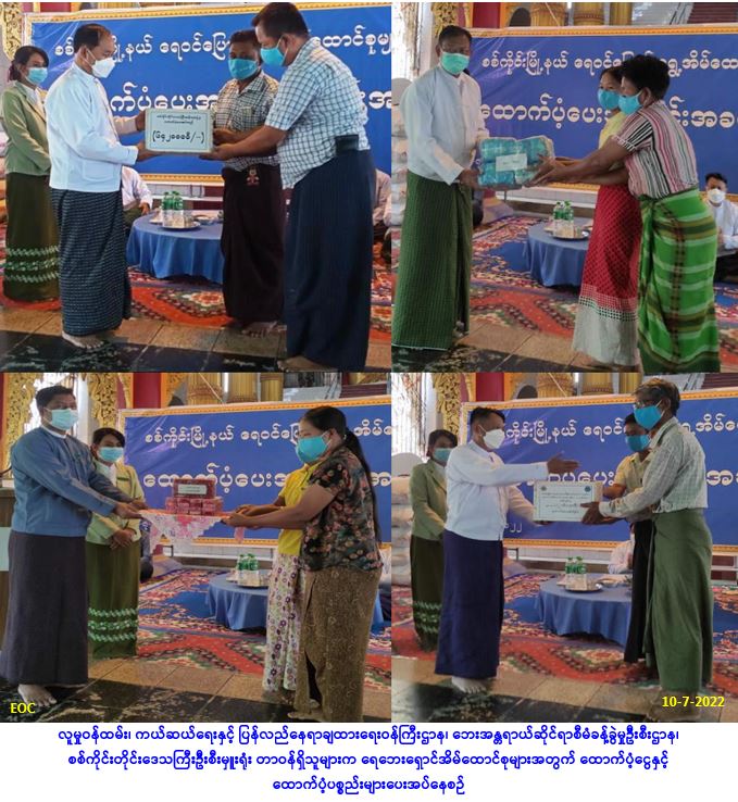 လူမှု၀န်ထမ်း၊ ကယ်ဆယ်ရေးနှင့် ပြန်လည်နေရာချထားရေး၀န်ကြီးဌာန၊ ဘေးအန္တရာယ်ဆိုင်ရာစီမံခန့်ခွဲမှု ဦးစီးဌာန၊ ပုသိမ်ခရိုင်ဦးစီးမှူးရုံးမှ တာ၀န်ရှိသူများသည် ပုသိမ်မြို့နယ်၊ စပါးထားကျေးရွာအုပ်စု၊ ခြေထောက်ကွင်းကျေးရွာတွင် (၈-၇-၂၀၂၂)ရက်နေ့တွင် ဖြစ်ပွားခဲ့သော တောဆင်ရိုင်းဘေးကြောင့် လုံး၀ ပျက်စီး (၀ါး/ဓနိ) နေအိမ် (၄)လုံးအတွက် အိမ်ဆောက်ပစ္စည်းဖိုးထောက်ပံငွေကျပ် (၄၀၀,၀၀ဝ/-)၊ တစ်စိတ်တစ်ပိုင်းပျက်စီးနေအိမ် (၅)လုံးအတွက် အိမ်ဆောက်ပစ္စည်းဖိုးထောက်ပံ့ငွေကျပ် (၁၅၀,၀၀ဝ/-)၊ ကျား/မ လူဦးရေ (၄၆)ဦးအတွက် (၇)ရက်စာ ဆန်ရိက္ခာဖိုးထောက်ပံ့ငွေကျပ် (၉၆,၆၀ဝိ/-)၊ စုစုပေါင်းထောက်ပံ့ငွေ (၆၄၆,၆၀ဝ/-)ကျပ်တိတိအား (၁၃-၇-၂၀၂၂)ရက်နေ့ (၁၂:၁၅)နာရီအချိန်တွင် သက်ဆိုင်ရာ တာ၀န်ရှိသူများရှေ့မှောက်၌ ဘေးသင့်ပြည်သူများလက်၀ယ်သို့ ထောက်ပံ့ပေးအပ်ခဲ့ကြောင်း သတင်းရရှိ ပါသည်။ … Read more
