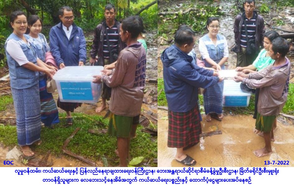 လူမှုဝန်ထမ်း၊ ကယ်ဆယ်ရေးနှင့် ပြန်လည်နေရာချထားရေးဝန်ကြီးဌာန၊ ဘေးအန္တရာယ်ဆိုင်ရာစီမံခန့်ခွဲမှု ဦးစီးဌာန၊ မြိတ်ခရိုင်ဦးစီးမှူးရုံးမှ တာဝန်ရှိသူများသည် မြိတ်မြို့နယ်၊ ကဟန်းကျေးရွာအုပ်စု၊ ကဟန်း ကျေးရွာ၌ (၁၂-၇-၂၀၂၂) ရက်နေ့တွင် မိုးသည်းထန်စွာရွာသွန်းပြီး လေပြင်းတိုက်ခတ်မှုကြောင့် လေဘေး သင့် လုံးဝပျက်စီးနေအိမ် (၁)လုံးအတွက် အိမ်ဆောက်ပစ္စည်းဖိုးထောက်ပံ့ငွေ (၁၀၀,၀၀ဝ/-) ကျပ်၊ လူဦးရေ (၉)ဦးအတွက် (၇)ရက်စာဆန်ရိက္ခာဖိုးငွေ (၁၈,၉၀ဝ/-)ကျပ်၊ စုစုပေါင်းထောက်ပံ့ငွေ (၁၁၈,၉၀၀/-) ကျပ်၊ ကယ်ဆယ်ရေးပစ္စည်း (၁၇)မျိုး(၁)ပုံး၊ အမက ကျောင်းသား (၁) ဦးနှင့် ကျောင်းသူ (၁) ဦးအတွက် ကျောင်းဝတ်စုံ ကျား/မ(၂)စုံတို့အား … Read more