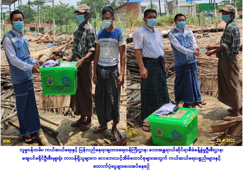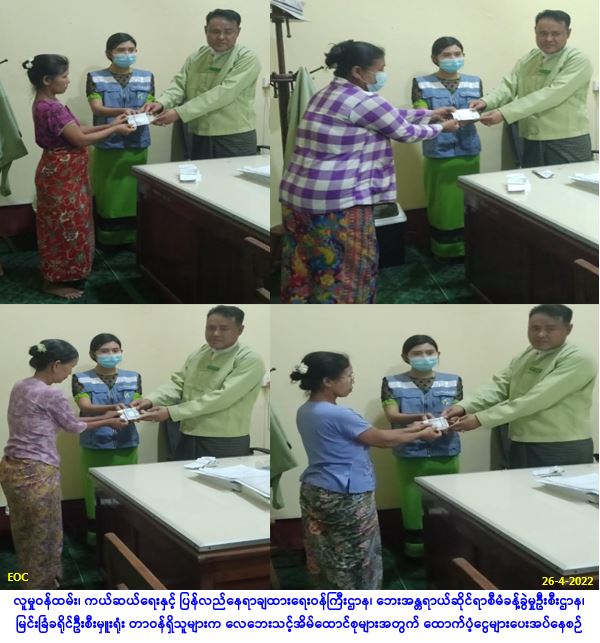 လူမှုဝန်ထမ်း၊ ကယ်ဆယ်ရေးနှင့် ပြန်လည်နေရာချထားရေးဝန်ကြီးဌာန၊ ဘေးအန္တရာယ်ဆိုင်ရာစီမံ ခန့်ခွဲမှုဦးစီးဌာန၊ မြောင်းမြခရိုင်ဦးစီးမှူးရုံးမှ တာဝန်ရှိသူများသည် မြောင်းမြခရိုင်၊ ဝါးခယ်မမြို့နယ်၊ ရွှေလောင်းကျေးရွာအုပ်စု၊ ရွာမကျေးရွာ၌ (၈-၄-၂၀၂၂)ရက်နေ့တွင် ဖြစ်ပွားခဲ့သော လေဘေးကြောင့် တစ်စိတ်တစ်ပိုင်းပျက်စီးနေအိမ် (၉)လုံးအတွက် အိမ်ဆောက်ပစ္စည်းဖိုးထောက်ပံ့ငွေ (၁၈၅,၀၀ဝ/-)၊ အိမ်ထောင်စု (၉)စုမှ လူဦးရေ (၄၃)ဦးတို့အတွက် ဆန်ရိက္ခာဖိုးထောက်ပံ့ငွေ (၉၀,၃၀ဝ/-)ကျပ်နှင့် surgical mask (၈၆)ခု၊ စုစုပေါင်းထောက်ပံ့ငွေ (၂၇၅,၃၀၀/-) ကျပ်တို့အား (၂၆-၄-၂၀၂၂) ရက်နေ့၊ နံနက် (၀၉:၃၀)နာရီအချိန်တွင် ရွှေလောင်းမြို့၊ အုပ်ချုပ်ရေးမှူးရုံးတွင် ဘေးသင့်ပြည်သူများ လက်ဝယ်အရောက် ထောက်ပံ့ပေးအပ်ခဲ့ကြောင်း သတင်းရရှိပါသည်။ … Read more