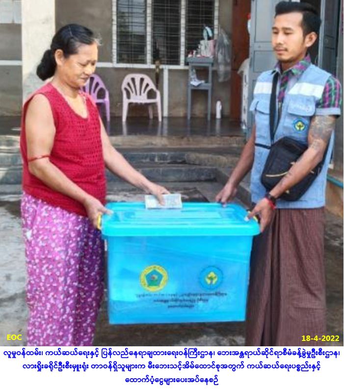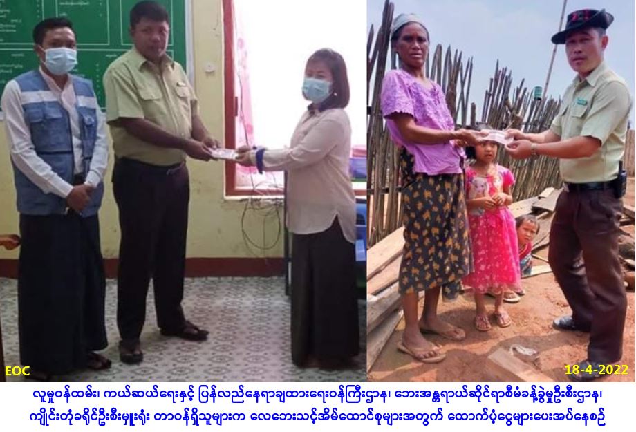 လူမှုဝန်ထမ်း၊ ကယ်ဆယ်ရေးနှင့် ပြန်လည်နေရာချထားရေးဝန်ကြီးဌာန၊ ဘေးအန္တရာယ်ဆိုင်ရာစီမံခန့်ခွဲမှုဦးစီးဌာန၊ ရန်ကုန်အရှေ့ပိုင်းခရိုင်ဦးစီးမှူးရုံးမှ တာဝန်ရှိသူများသည် ရန်ကုန်တိုင်းဒေသကြီး၊ အရှေ့ပိုင်းခရိုင်၊ ဒေါပုံမြို့နယ်၊ ကြည်စုရပ်ကွက်၊ ဇေယျာသိဒ္ဓိလမ်းနှင့် ဇေယျာသီရိလမ်း၌ (၂၈-၃-၂၀၂၂)ရက်နေ့၊ (၂၁:၁၀)နာရီအချိန်တွင် ဖြစ်ပွားခဲ့သော မီးလောင်ကျွမ်းမှုကြောင့် အိမ်ခြေ(၁)လုံး လုံးဝပျက်စီးခဲ့ပြီး အိမ်ထောင်စု(၁)စုမှ လူဦးရေ (၅)ဦးတို့ မီးဘေးသင့်ခဲ့ပါသဖြင့် မီးဘေးသင့်အိမ်ခြေ(၁)လုံးအတွက် အိမ်ဆောက်ပစ္စည်းဖိုးထောက်ပံ့ငွေကျပ် (၂၀၀၀၀၀/-)ကျပ်၊ လူဦးရေ (၅)ဦးအတွက် ဆန်ရိက္ခာဖိုးထောက်ပံ့ငွေကျပ် (၁၀၅၀၀/-)ကျပ်၊ ကယ်ဆယ်ရေးပစ္စည်း (၁၇)မျိုး (၁)အိမ်ထောင်စုစာနှင့် ကိုဗစ်-၁၉ ကြိုတင်ကာကွယ်ရန် အိမ်ထောင်စု (၁)စုအတွက် ဆပ်ပြာ (၁)တောင့်၊ လူဦးရေ(၅)ဦးအတွက် Mask … Read more