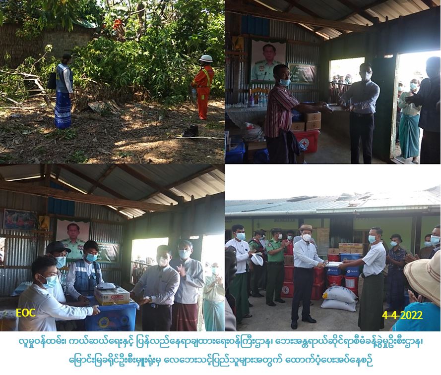 လူမှုဝန်ထမ်း၊ ကယ်ဆယ်ရေးနှင့် ပြန်လည်နေရာချထားရေးဝန်ကြီးဌာန၊ ဘေးအန္တရာယ်ဆိုင်ရာစီမံခန့်ခွဲမှုဦးစီးဌာန၊ မြောင်းမြခရိုင်ဦးစီးမှူးရုံးမှ တာဝန်ရှိသူများသည် မြောင်းမြခရိုင်၊ ဝါးခယ်မမြို့နယ်အတွင်း (၃-၄-၂၀၂၂) ရက်နေ့၌ ဖြစ်ပွားခဲ့သော လေဘေးကြောင့် ဝါးခယ်မမြို့နယ်၊ ပိတ္တာလေးကျေးရွာအုပ်စု(ရွာမကျေးရွာ)၊ စော်ကဲကျေးရွာအုပ်စု(ရွာမကျေးရွာ)၊ ရေလယ်ကျွန်းကျေးရွာအုပ်စု(ရေလယ်ကျွန်းကျေးရွာ)နှင့် စံအိပ်ကျေးရွာအုပ်စု(တလိုင်းစုကျေးရွာ၊ အထက်စုကျေးရွာ၊ အောက်စုကျေးရွာ၊ ကြူတောကျေးရွာ)တို့တွင် ပြိုကျပျက်စီးခဲ့သောနေအိမ်(၁၂)လုံးအတွက် ကယ်ဆယ်ရေးပစ္စည်း (၁၇)မျိုး အိမ်ထောင်စု (၁၂)စုစာ၊ လူဉီးရေ (၉၃) ဦးတို့အတွက် Surgical Mask (၁၈၆)ခု၊ ဆန်ရိက္ခာရန်ပုံငွေ (၁၉၅,၃၀၀)ကျပ်၊ ပြိုကျပျက်စီးနေအိမ်(၁၂)လုံး၊ တစ်စိတ်တစ်ပိုင်းပျက်စီးနေအိမ် (၉)လုံးနှင့် ဘုန်းကြီးကျောင်း (၁)ကျောင်းတို့အတွက် အိမ်ဆောက်ပစ္စည်းရန်ပုံငွေ (၁,၇၄၀,၀၀၀)ကျပ်၊ … Read more
