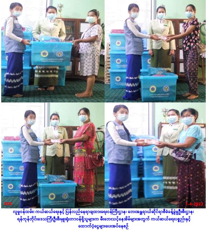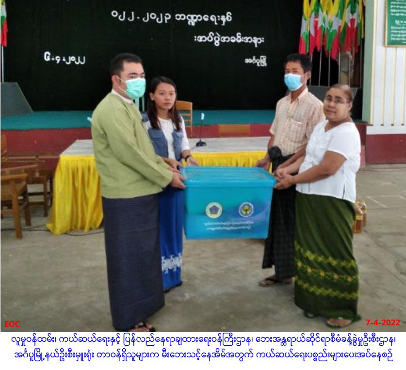 လူမှုဝန်ထမ်း၊ ကယ်ဆယ်ရေးနှင့် ပြန်လည်နေရာချထားရေးဝန်ကြီးဌာန၊ ဘေးအန္တရာယ်ဆိုင်ရာစီမံခန့်ခွဲမှုဦးစီးဌာန၊ ရန်ကုန်တိုင်းဒေသကြီးဦးစီးမှူးရုံးမှ တာဝန်ရှိသူများသည် ရန်ကုန်တိုင်းဒေသကြီး၊ အရှေ့ပိုင်းခရိုင်၊ မြောက်ဥက္ကလာ ပမြို့နယ်၊ (၂) ရပ်ကွက်၊ သုမာလာ(၁၄)လမ်းတွင်(၅-၄-၂၀၂၂)ရက်နေ့၊ (၀၉း၀၇)နာရီအချိန်တွင် ဖြစ်ပွားခဲ့သော မီးဘေးကြောင့် လုံးဝပျက်စီးအိမ်ခြေ (၆)လုံး၊ အိမ်ထောင်စု(၁၁)စုမှ လူဦးရေ (၅၄)ဦးတို့အတွက် အိမ်ဆောက် ပစ္စည်းဖိုးထောက်ပံ့ငွေ (၁,၂၀၀,၀၀၀/-)ကျပ်နှင့် ဆန်ရိက္ခာဖိုးထောက်ပံ့ငွေ (၁၁၃,၄၀၀/-)ကျပ်၊ ကယ်ဆယ်ရေး ပစ္စည်း (၁၇)မျိုး (၁၁)အိမ်ထောင်စုစာနှင့် ကိုဗစ်-၁၉ ကြိုတင်ကာကွယ်ဖို့ အိမ်ထောင်စု (၁၁)စုအတွက် ဆပ်ပြာ (၁၁)တောင့်၊ လူဦးရေ(၅၄)ဦးအတွက် mask (၁၀၈)ခုတို့အား မြောက်ဥက္ကလာပမြို့နယ် … Read more