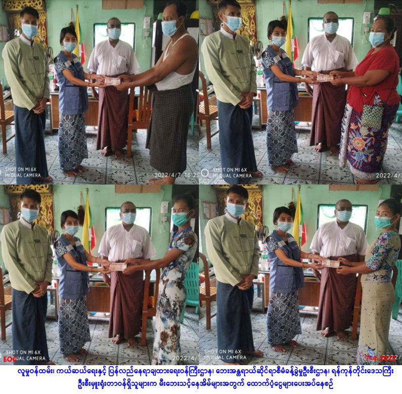 လူမှုဝန်ထမ်း၊ ကယ်ဆယ်ရေးနှင့် ပြန်လည်နေရာချထားရေးဝန်ကြီးဌာန၊ ဘေးအန္တရာယ်ဆိုင်ရာစီမံခန့်ခွဲမှုဦးစီးဌာန၊ ရန်ကုန်တိုင်းဒေသကြီးဦးစီးမှူးရုံးမှ တာဝန်ရှိသူများသည် ရန်ကုန်တိုင်းဒေသကြီး၊ မရမ်းကုန်းမြို့နယ်၊ အမှတ်(၃) ရပ်ကွက်၊ မရမ်းစု၊ ကြည်စေတနာလမ်းတွင်(၂၈-၃-၂၀၂၂)ရက်နေ့( ၀၉း၀၀)နာရီအချိန်တွင် ဖြစ်ပွားခဲ့သော မီးဘေး ကြောင့် ဘေးသင့်လုံးဝပျက်စီးအိမ်ခြေ (၆)လုံး၊ အိမ်ထောင်စု(၆)စုမှ လူဦးရေ (၃၀)ဦးတို့အတွက် ဆန်ရိက္ခာ ဖိုးထောက်ပံ့ငွေ (၆၃,၀၀ဝ/-)၊ ကယ်ဆယ်ရေးပစ္စည်း (၁၇)မျိုး (၆)အိမ်ထောင်စုစာနှင့် ကိုဗစ်-၁၉ ကြိုတင် ကာကွယ်ဖို့ အိမ်ထောင်စု (၆) စုအတွက် ဆပ်ပြာ (၆)တောင့်၊ လူဦးရေ (၃၀)ဦးအတွက် mask (၆၀) ခုတို့အား … Read more