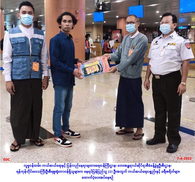 လူမှုဝန်ထမ်း၊ ကယ်ဆယ်ရေးနှင့် ပြန်လည်နေရာချထားရေးဝန်ကြီးဌာန၊ ဘေးအန္တရာယ်ဆိုင်ရာစီမံခန့်ခွဲမှုဦးစီးဌာန၊ ရန်ကုန်တိုင်းဒေသကြီးဦးစီးမှူးရုံးမှ တာဝန်ရှိသူများသည် အင်ဒိုနီးရှားနိုင်ငံ၊ ဘာတန်မြို့မှ ပြန်လည်ရောက်ရှိ လာသော မြန်မာသင်္ဘောသား (၁) ဦးအတွက် ကယ်ဆယ်ရေးပစ္စည်း (၄) မျိုး( ကျားလုံချည်၊ တီရှပ်၊ တဘက်နှင့် ဆပ်ပြာ) နှင့် နေ့တွက်ခရီးစရိတ် (၃၀၀၀/-) ကျပ်တို့အား (၇-၄-၂၀၂၂) ရက်နေ့၊ (၁၆း၃၀) နာရီအချိန်တွင် သွားရောက်ထောက်ပံ့ပေးအပ်ခဲ့ကြောင်း သတင်းရရှိပါသည်။ #otr #ygn_apr2022 Source: ရန်ကုန်တိုင်းဒေသကြီးဦးစီးမှူးရုံး (ဘစမ)