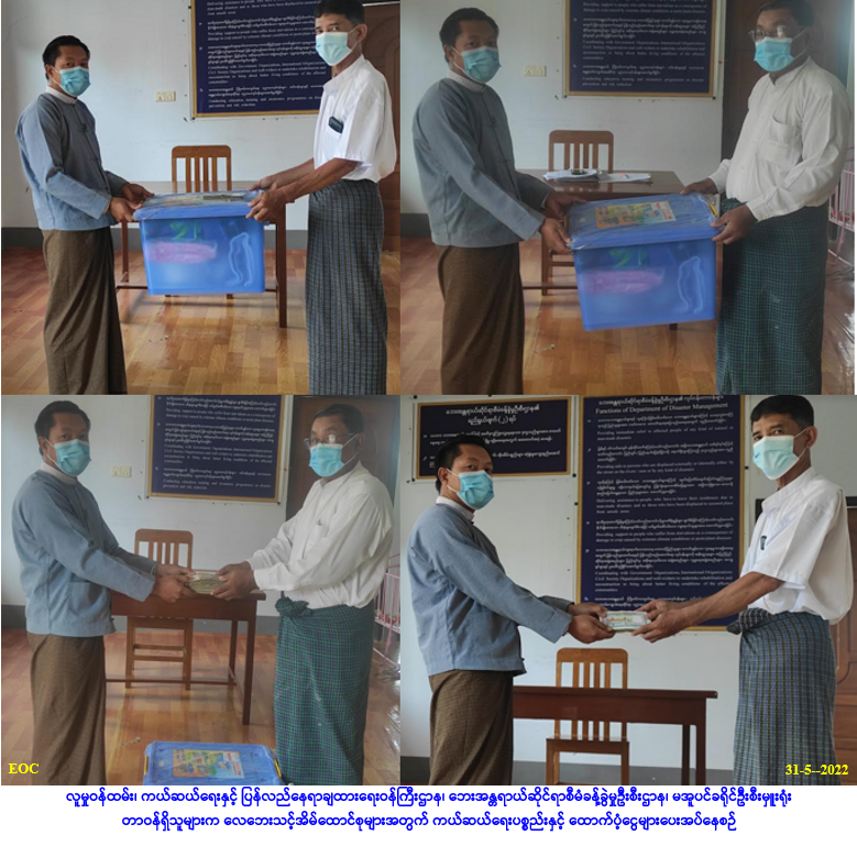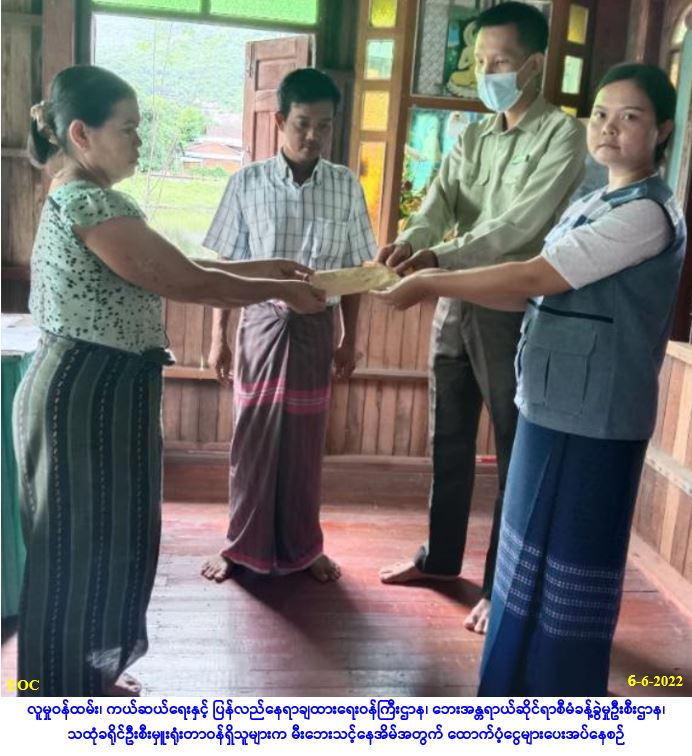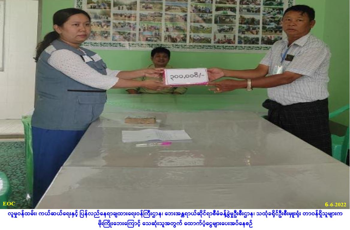 လူမှုဝန်ထမ်း၊ ကယ်ဆယ်ရေးနှင့် ပြန်လည်နေရာချထားရေးဝန်ကြီးဌာန၊ ဘေးအန္တရာယ်ဆိုင်ရာစီမံခန့်ခွဲမှု ဦးစီးဌာန၊ သထုံခရိုင်ဦးစီးမှူးရုံးမှ တာဝန်ရှိသူများသည် ပေါင်မြို့နယ်၊ ဆားဖိုစုရပ်ကွက်၌ (၃-၆-၂၀၂၂) ရက် နေ့ (၁၀း၁၀) နာရီအချိန်ခန့်တွင် ဖြစ်ပွားခဲ့သော မီးလောင်ကျွမ်းမှုကြောင့် တစိတ်တပိုင်းပျက်စီးခဲ့သည့် လူနေ အိမ် (၁)လုံးအတွက် အိမ်ဆောက်ပစ္စည်းဖိုးငွေ (၉၀,၀၀၀/-)၊ လူဦးရေ (၅)ဦးတို့အတွက် (၇)ရက်စာ ဆန်ရိက္ခာ ဖိုးငွေ(၁၀,၅၀၀/-)နှင့် ဒဏ်ရာရလူနာ (၁)ဦးအတွက် ထောက်ပံ့ငွေ (၅၀,၀၀၀/-) စုစုပေါင်း ထောက်ပံ့ငွေ (၁၅၀,၅၀၀/-) ကျပ်တို့အား (၆-၆-၂၀၂၂)ရက်နေ့ (၁၂:၃၀) နာရီအချိန်ခန့်တွင် ပေါင်မြို့နယ်၊ ဆားဖိုစုရပ်ကွက် အုပ်ချုပ်ရေးမှူးရုံး၌ … Read more