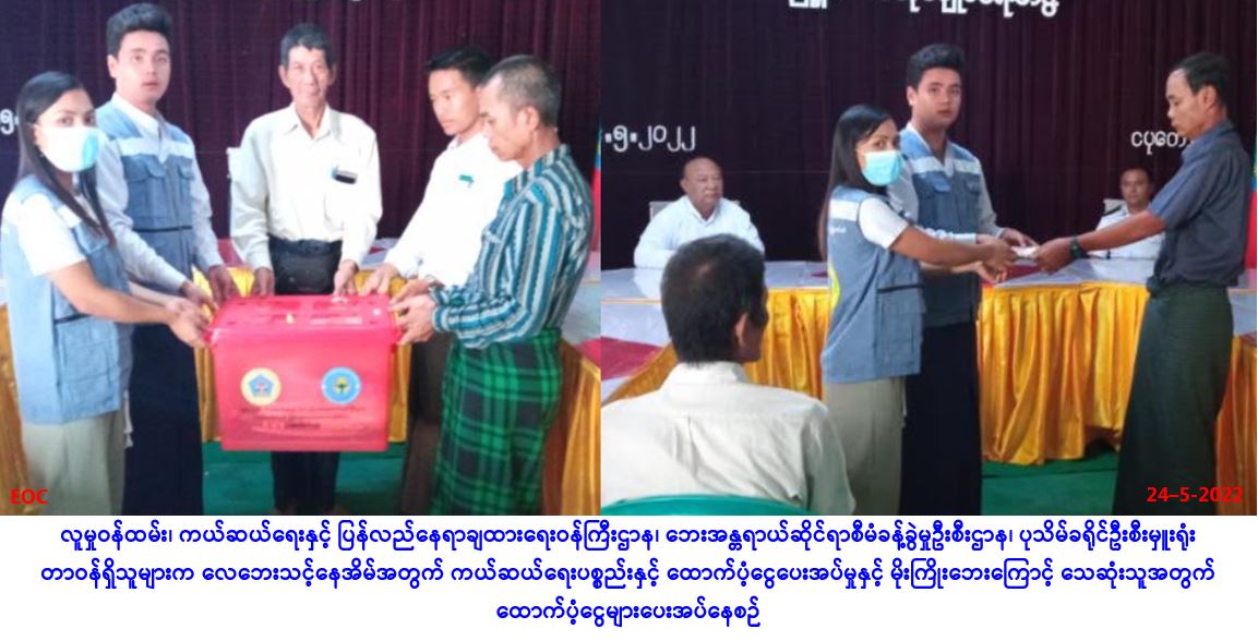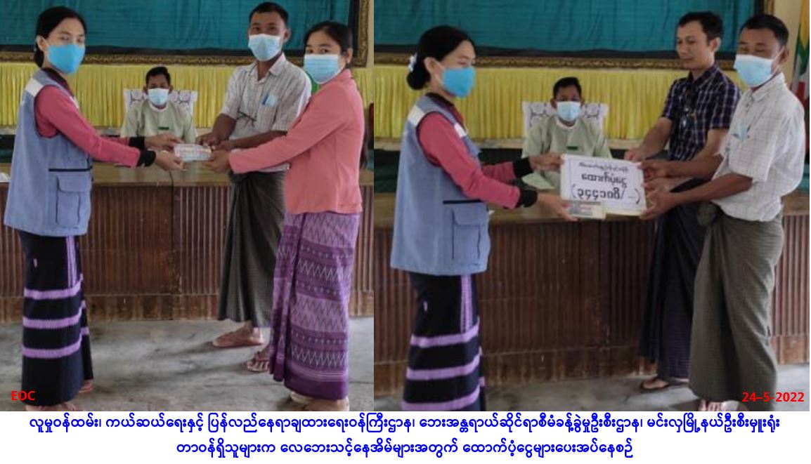 လူမှုဝန်ထမ်း၊ ကယ်ဆယ်ရေးနှင့် ပြန်လည်နေရာချထားရေးဝန်ကြီးဌာန၊ ဘေးအန္တရာယ်ဆိုင်ရာစီမံခန့်ခွဲမှုဦးစီးဌာန၊ ပဲခူးတိုင်းဒေသကြီး၊ သာယာဝတီခရိုင်၊ မင်းလှမြို့နယ်ဦးစီးမှူးရုံးမှ တာဝန်ရှိသူများသည် ပဲခူးတိုင်းဒေသကြီး၊ သာယာဝတီခရိုင်၊ အုတ်ဖိုမြို့နယ်၊ ဖလန်ပင်ကျေးရွာအုပ်စု၊ ဖလန်ပင်ကျေးရွာ၌ (၂၁-၅-၂၀၂၂)ရက်နေ့တွင် ဖြစ်ပွားခဲ့သော လေဘေးကြောင့် အမိုးလန်လူနေအိမ် (၈)လုံးတို့အတွက် အိမ်ဆောက်ပစ္စည်းဖိုးထောက်ပံ့ငွေ(၃၀၀,၀၀ဝ/-)ကျပ်၊ လူဦးရေ (၂၁)ဦးအတွက် ဆန်ရိက္ခာဖိုးငွေ (၇) ရက်စာ (၄၄,၁၀ဝ/-) ကျပ်၊ စုစုပေါင်း ထောက်ပံ့ငွေ (၃၄၄,၁၀ဝ/-)ကျပ်တို့အား (၂၄-၅-၂၀၂၂)ရက်နေ့၊ (၁၀းဝဝ)နာရီအချိန်တွင် မြို့နယ်အထွေထွေ အုပ်ချုပ်ရေးဦးစီးဌာနမှ ဒုတိယမြို့နယ်အုပ်ချုပ်ရေးမှူးနှင့်တာဝန်ရှိသူများ၊ ကျေးရွာအုပ်ချုပ်ရေးမှူး၊ ရပ်/ကျေး စာရေးတို့နှင့်အတူ အထွေထွေအုပ်ချုပ်ရေးဦးစီးဌာန အစည်းအဝေးခန်းမတွင် ဘေးသင့်ပြည်သူများ … Read more