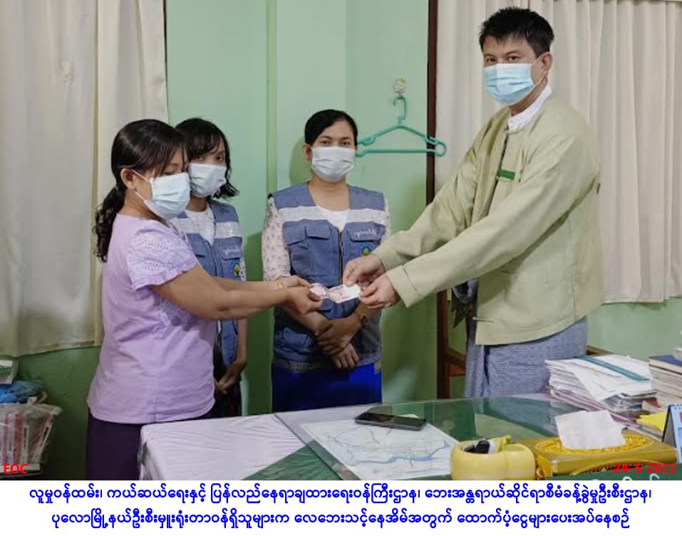 လူမှုဝန်ထမ်း၊ ကယ်ဆယ်ရေးနှင့်ပြန်လည်နေရာချထားရေးဝန်ကြီးဌာန၊ ဘေးအန္တရာယ်ဆိုင်ရာစီမံခန့်ခွဲမှုဦးစီးဌာန၊ ရေကြည်မြို့နယ်ဦးစီးမှူးရုံးမှ တာဝန်ရှိသူများသည် ရေကြည်မြို့နယ်၊ ငါးသိုင်းချောင်းမြို့၊ ကျောက်ချောင်းကျေးရွာအုပ်စု၊ ပျဉ်းကိုးပင်ကျေးရွာတွင် (၂၂.၅.၂၀၂၂) ရက်နေ့၌ဖြစ်ပွားခဲ့သော လေဘေးကြောင့် အမိုးလန်ပျက်စီးနေအိမ်(၁)လုံးအတွက် အိမ်ဆောက်ပစ္စည်းဖိုး (၅၀၀၀ဝိ/-)၊ ဘေးသင့်လူဦးရေ(၅)ဦးအတွက်ဆန်ရိက္ခာ(၇)ရက်စာရန်ပုံငွေ (၁၀၅၀၀ိ/-)၊ အထောက်အကူပြု (Mask) (၁၀)ခု၊ စုစုပေါင်းရန်ပုံငွေ(၆၀၅၀ဝိ/-)အား (၂၄-၅-၂၀၂၂)ရက်နေ့၊ (၁၄း၀၀)နာရီအချိန်၌ တာဝန်ရှိသူများ၏ရှေ့မှောက်တွင် ဘေးသင့်ပြည်သူများ၏ လက်ဝယ်အရောက် ထောက်ပံ့ပေးအပ်ခဲ့ပါကြောင်း သတင်းရရှိပါသည်။ #ar #ayy_may_2022 Source: ရေကြည်မြို့နယ်ဦးစီးမှူးရုံး(ဘစမ)