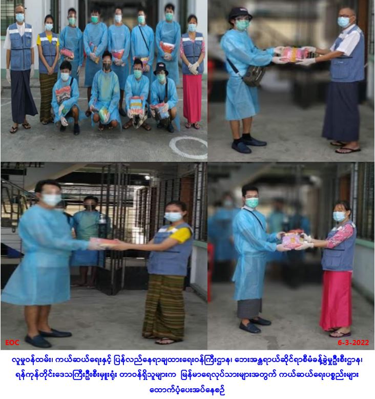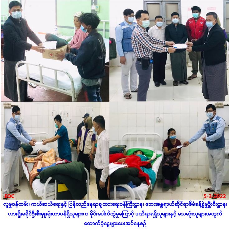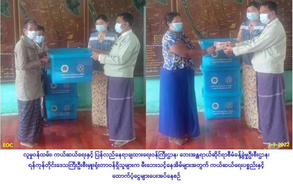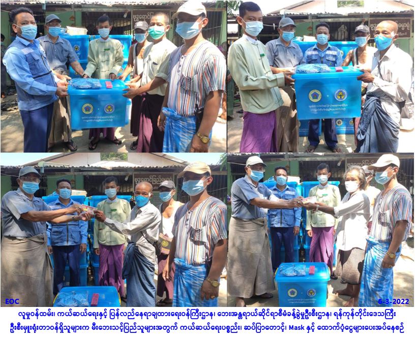 လူမှုဝန်ထမ်း၊ ကယ်ဆယ်ရေးနှင့် ပြန်လည်နေရာချထားရေးဝန်ကြီးဌာန၊ ဘေးအန္တရာယ်ဆိုင်ရာစီမံခန့်ခွဲမှုဦးစီးဌာန၊ ရန်ကုန်တိုင်းဒေသကြီးဦးစီးမှူးရုံးမှ တာဝန်ရှိသူများသည် ရန်ကုန်တိုင်းဒေသကြီး၊ ရွှေပြည်သာမြို့နယ်၊ အမှတ် (၂၃) ရပ်ကွက်(ဝါးတရာ) လမ်းဘေးတွင် (၂-၃-၂၀၂၂)ရက်နေ့၊ (၀၆း၃၅)နာရီအချိန်၌မီးလောင်မှုဖြစ်ပွားခဲ့ရာ ကျူးကျော် တဲအိမ်ခြေ (၃) လုံး၊ အိမ်ထောင်စု (၃) စုမှ လူဦးရေ (၁၈) ဦးတို့အတွက် ဆန်ရိက္ခာဖိုးထောက်ပံ့ငွေ (၃၇,၈၀၀/-)၊ ကယ်ဆယ်ရေးပစ္စည်း (၁၇) မျိုး အိမ်ထောင်စု(၃)စုစာနှင့် ကိုဗစ်-၁၉ ကြိုတင်ကာကွယ်နိုင်ရန် အိမ်ထောင်စု (၃)စုစာအတွက် ဆပ်ပြာ (၃)တောင့်၊ လူဦးရေ (၁၈)ဦးအတွက် Mask (၃၆)ခုတို့အား … Read more