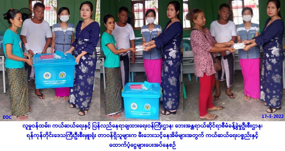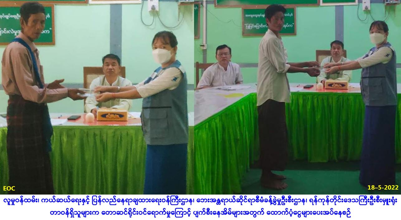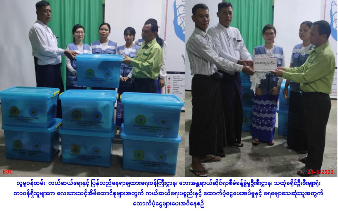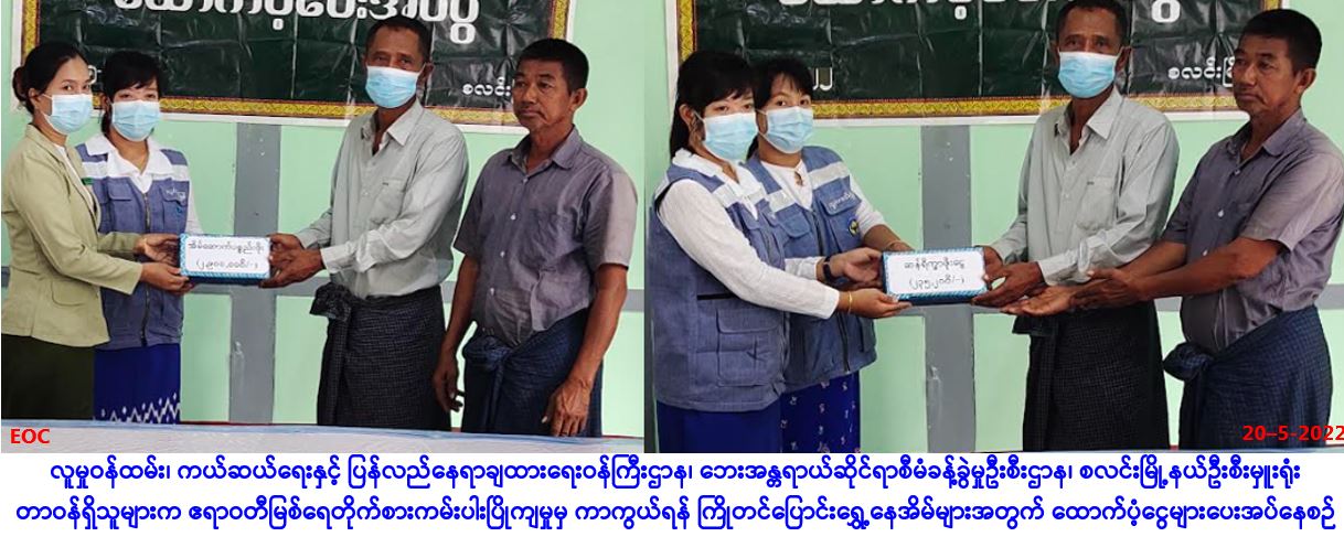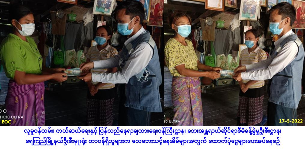 လူမှုဝန်ထမ်း၊ ကယ်ဆယ်ရေးနှင့် ပြန်လည်နေရာချထားရေးဝန်ကြီးဌာန၊ ဘေးအန္တရာယ်ဆိုင်ရာစီမံခန့်ခွဲမှု ဦးစီးဌာန၊ ရေကြည်မြို့နယ်ဦးစီးမှူးရုံးမှတာဝန်ရှိသူများသည် ရေကြည်မြို့နယ်၊ သစ်ဖြူပင်ကျေးရွာအုပ်စု၊ သစ်ဖြူပင်ကျေးရွာ၌ (၉-၅-၂၀၂၂) ရက်နေ့တွင် ဖြစ်ပွားခဲ့သော လေဘေးကြောင့် အမိုးလန်ပျက်စီး နေအိမ် (၃) လုံးအတွက် အိမ်ဆောက်ပစ္စည်းဖိုးထောက်ပံ့ငွေ (၁၅၀,၀၀ဝ/-)၊ လူဦးရေ (၁၄) ဦးတို့အတွက် ဆန်ရိက္ခာဖိုးငွေ (၇)ရက်စာ (၂၉,၄၀၀/-)၊ အထောက်အကူပြု (Mask) (၂၈) ခု၊ စုစုပေါင်း ထောက်ပံ့ငွေ (၁၇၉,၄၀ဝ/-)ကျပ်တို့အား (၁၇-၅-၂၀၂၂)ရက်နေ့ (၁၄း၀၀)နာရီအချိန်တွင် တာဝန်ရှိသူများရှေ့မှောက်၌ ဘေးသင့်ပြည်သူများ လက်ဝယ်အရောက် ထောက်ပံ့ပေးအပ်ခဲ့ကြောင်း သတင်းရရှိပါသည်။ … Read more